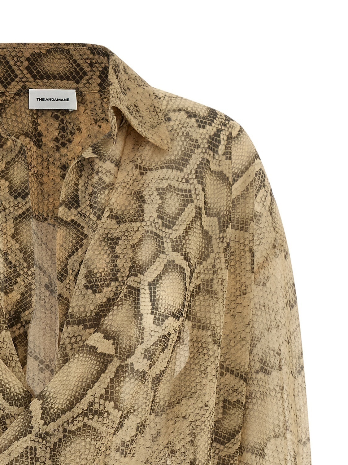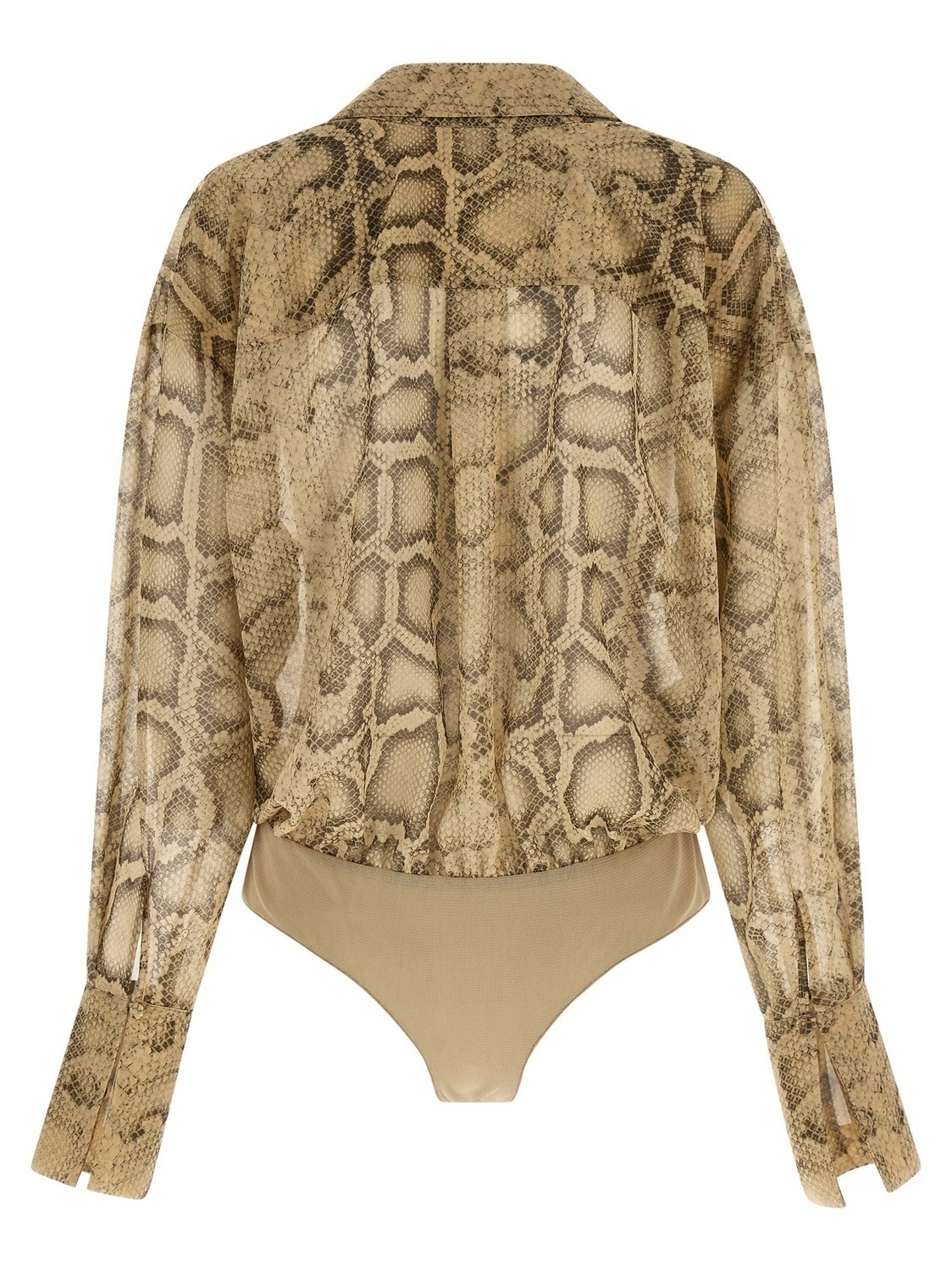 Боди «Paloma» из полупрозрачной ткани с принтом под питона, рубашечный воротник с разрезом, перекрестный и драпированный перед, длинные рукава с манжетами и заниженной линией плеча, застежка на кнопки внизу изделия.