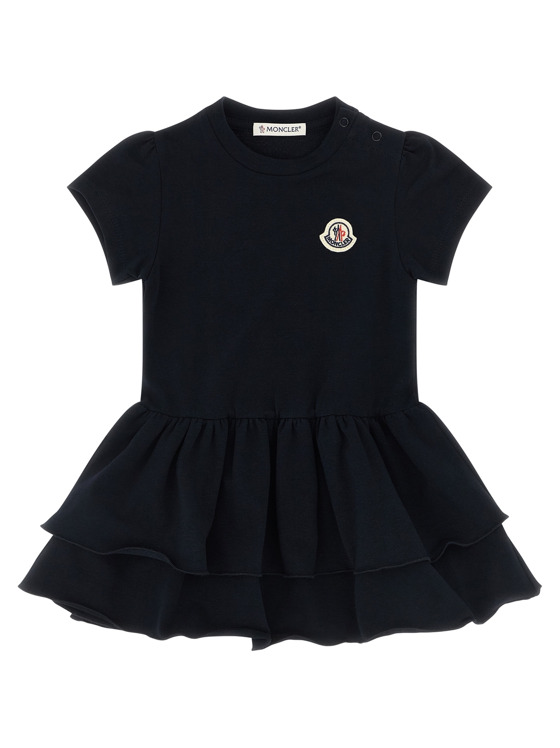 Платье из эластичного хлопка, нашивка-логотип из фетра спереди, круглый вырез, кнопки на левом плече, короткие рукава, юбка с воланами.