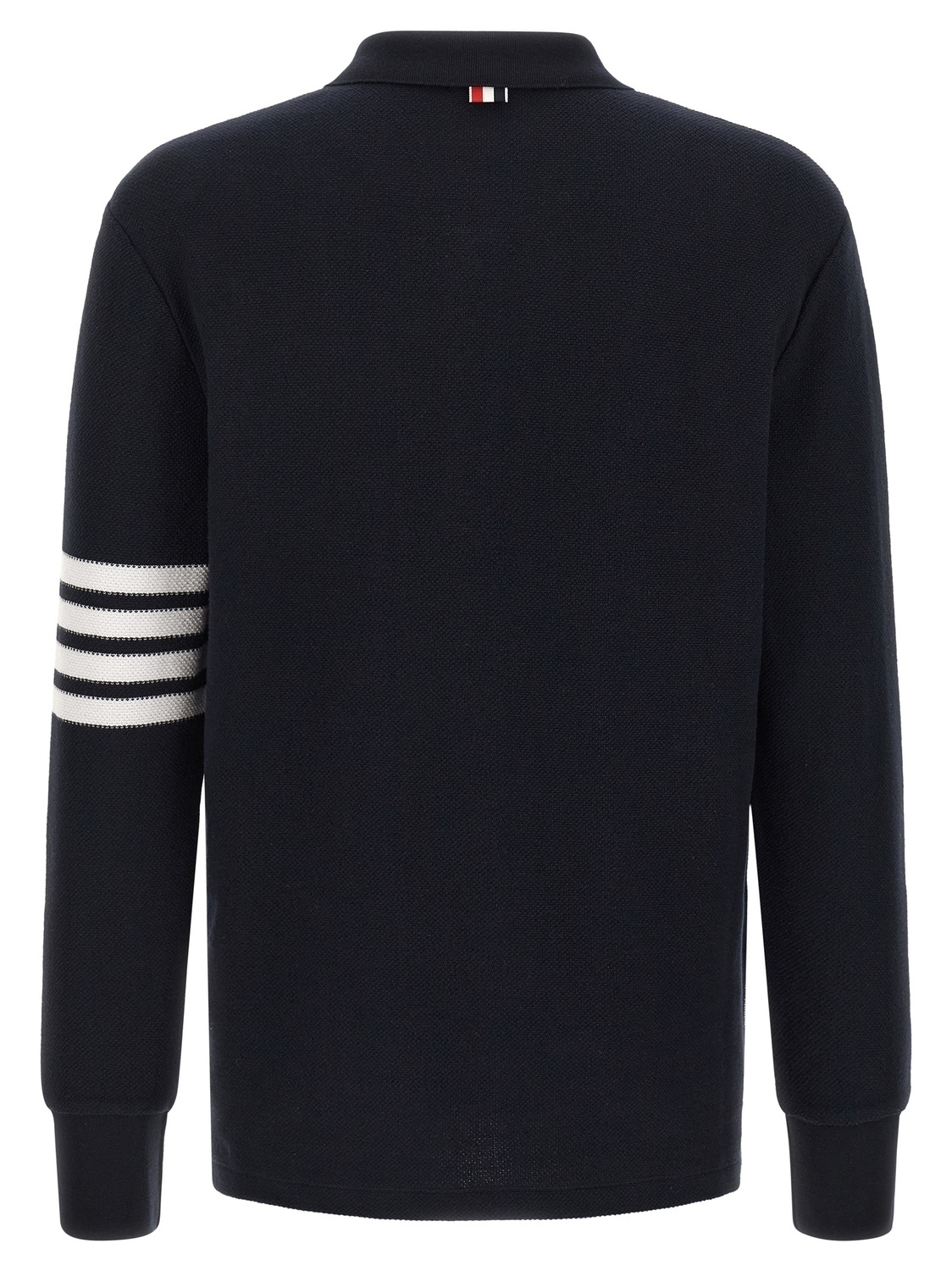 Текстурированная хлопковая футболка поло пике, нашивка с логотипом спереди, воротник и пуговицы, длинные рукава с контрастными «4 полосами» и манжетами, боковые разрезы с пуговицами и лентой из атласной тесьмы «RWB», асимметричный низ.