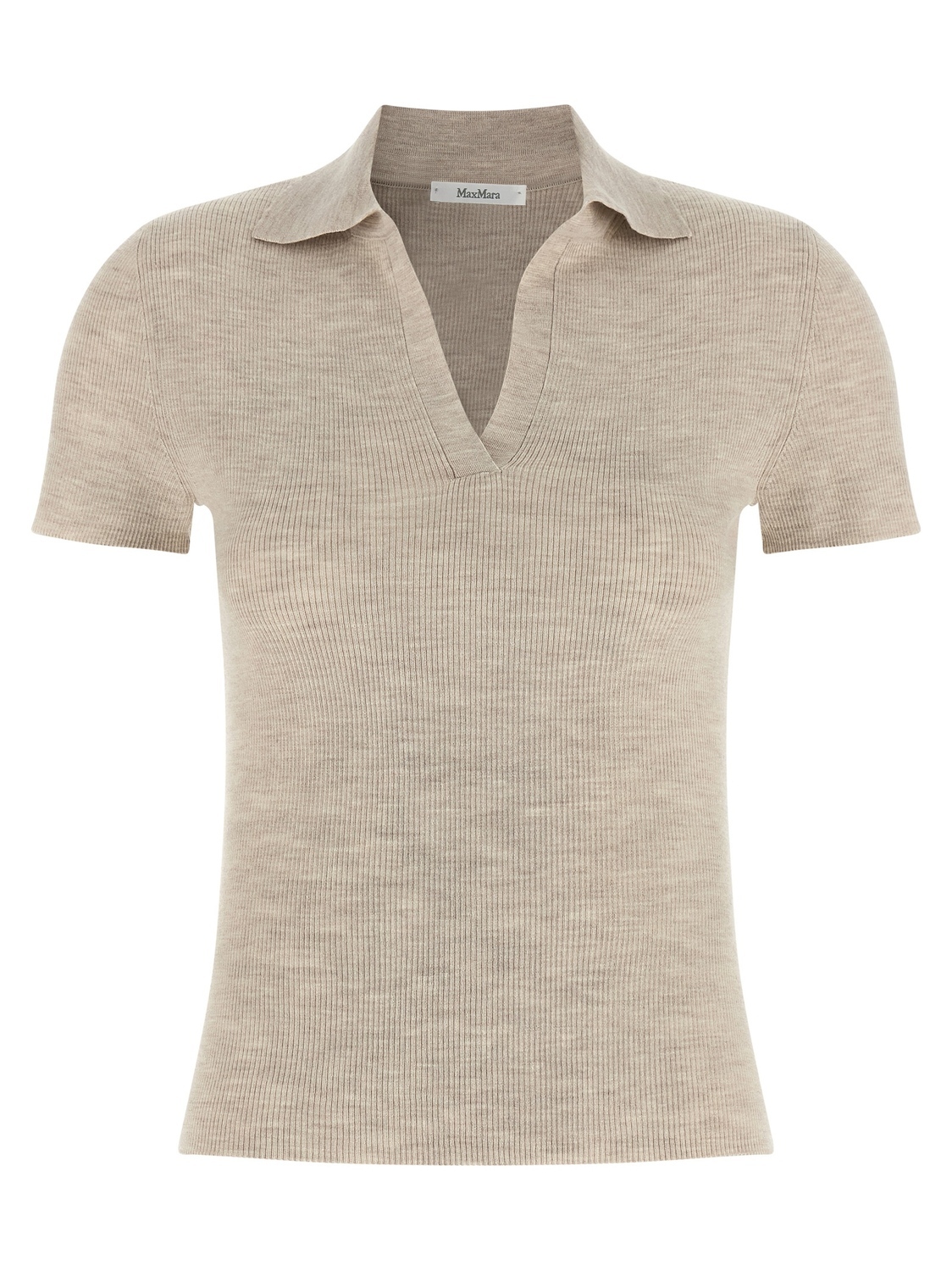 Поло «Mxmalbero» из тонкой пряжи из чистой меланжевой шерсти в рубчик с воротником, V-образным вырезом и короткими рукавами.