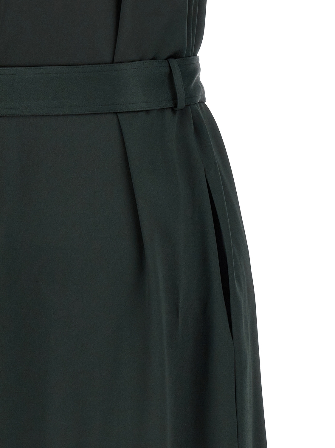 Длинное платье из креп-сатина, с американским вырезом и контрастной кожаной отделкой, застежкой на пуговицу и разрезом спереди, без рукавов, со съемным поясом.