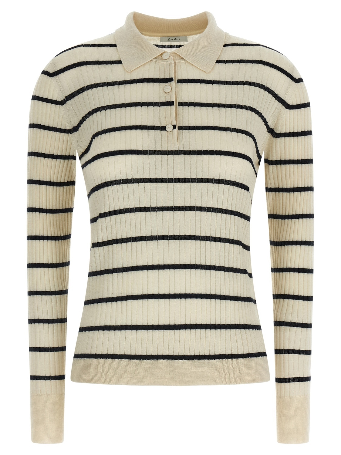Поло из полосатой кашемировой и эластичной шелковой пряжи 'MxpGitano' с рубчатым узором, воротником и пуговицами, длинными рукавами с манжетами.
