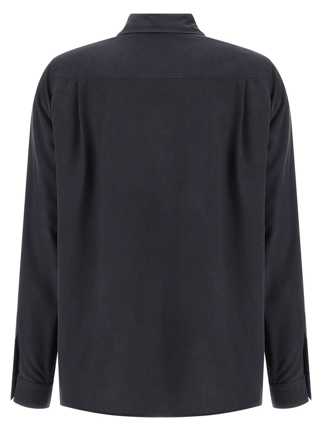 Рубашка 'MxmSiamese' из чистого вымытого шелкового канваса, нагрудный карман, скрытая застежка на пуговицы спереди, длинные рукава с манжетами и металлической аппликацией с логотипом, боковые разрезы, закругленный и асимметричный низ.