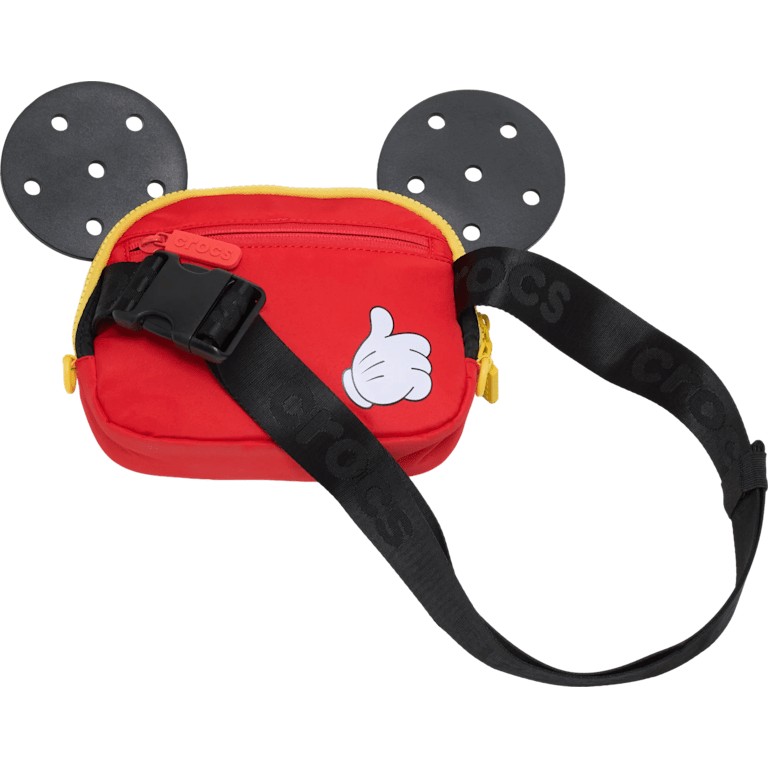 Сумка-пояс с Микки Маусом — это свобода рук, удобство и яркий характер, идеальная для походов в тематический парк или обычных дел. Эта лимитированная модель имеет красную основу с 12 отверстиями для Jibbitz и украшена ушками Микки, на которых расположены ещё 12 дополнительных отверстий для Jibbitz — можно персонализировать на свой вкус! Регулируемый ремень позволяет носить её как удобно, а жёлтая верхняя молния обеспечивает лёгкий доступ к содержимому, а задний карман на молнии — дополнительное место для мелочей.