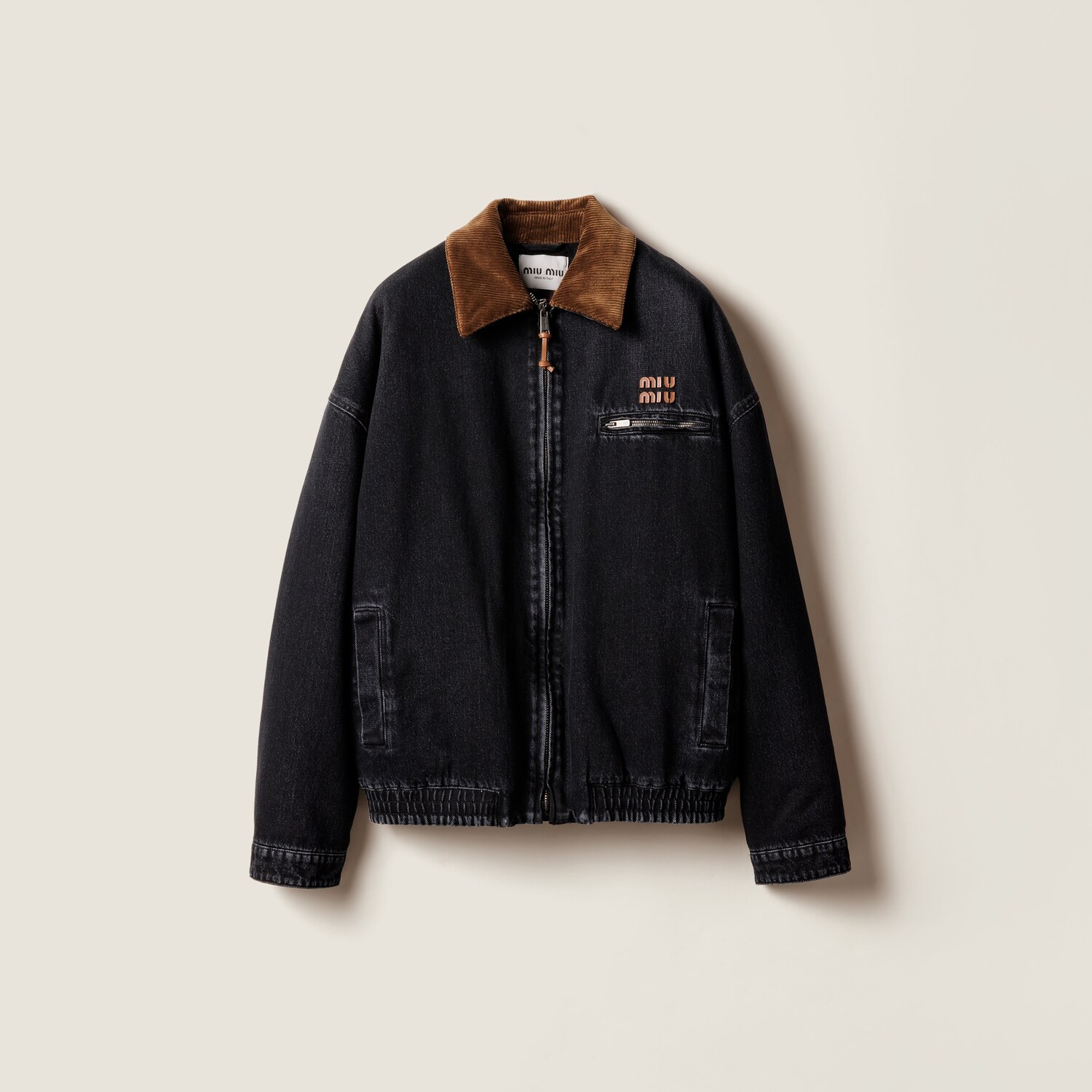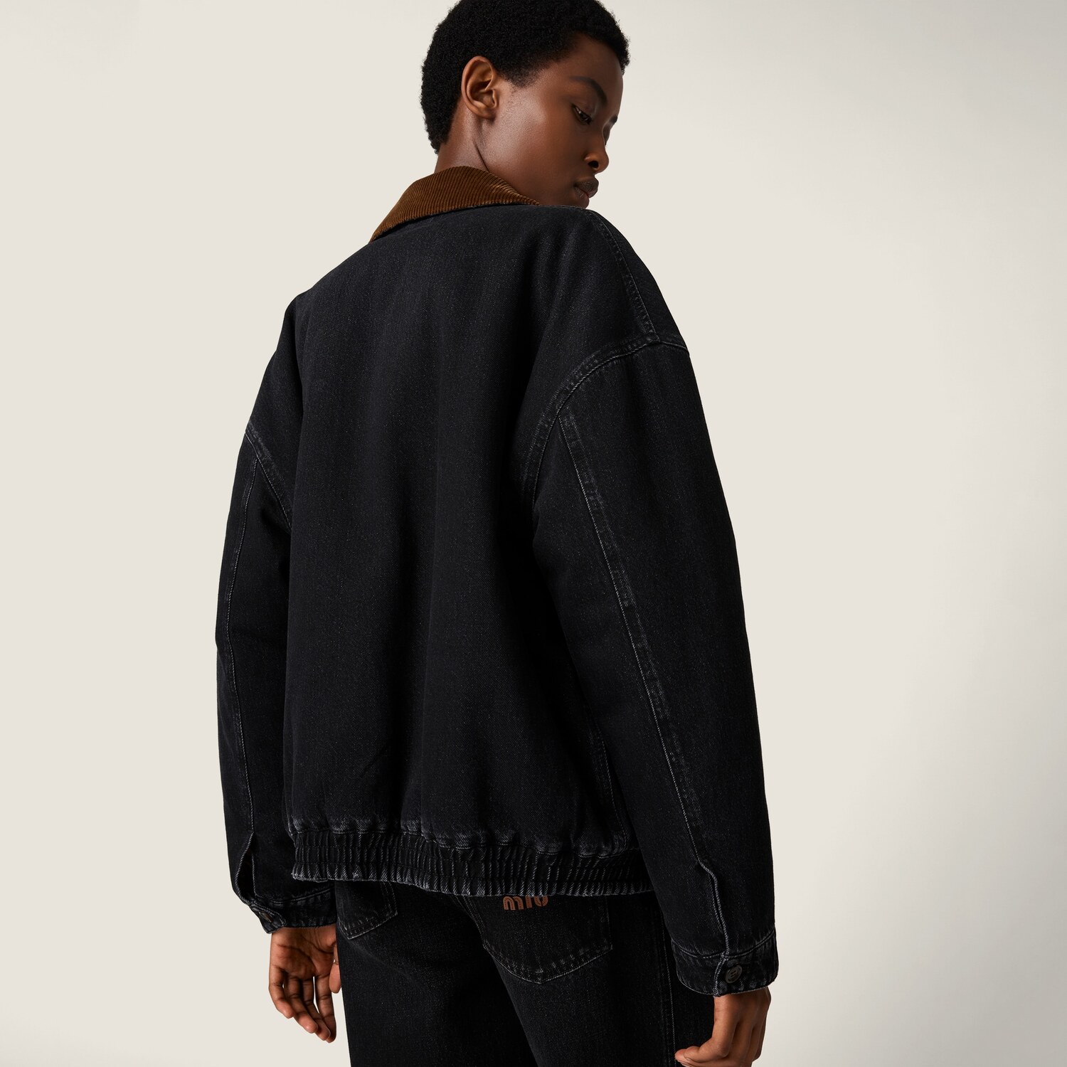 Деним, символ гардероба Miu Miu, определяет фактуру этой куртки-блузона, отличающейся равномерной окраской и насыщенным черным цветом, который подчеркивает контрастные детали из вельвета и кожи.