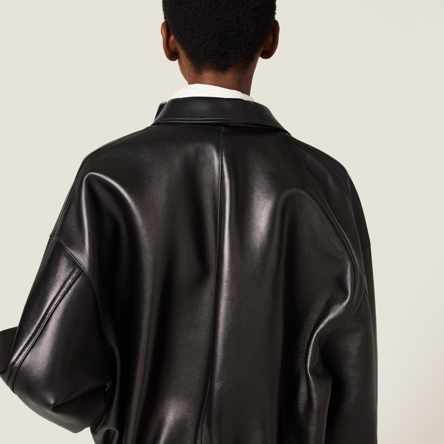 Мягкая наппа скрепляется с фирменным трикотажем Miu Miu, создавая изделие изысканного качества, воплощающее беззаботное, бунтарское очарование, символом которого становятся необработанные края и свободный крой.