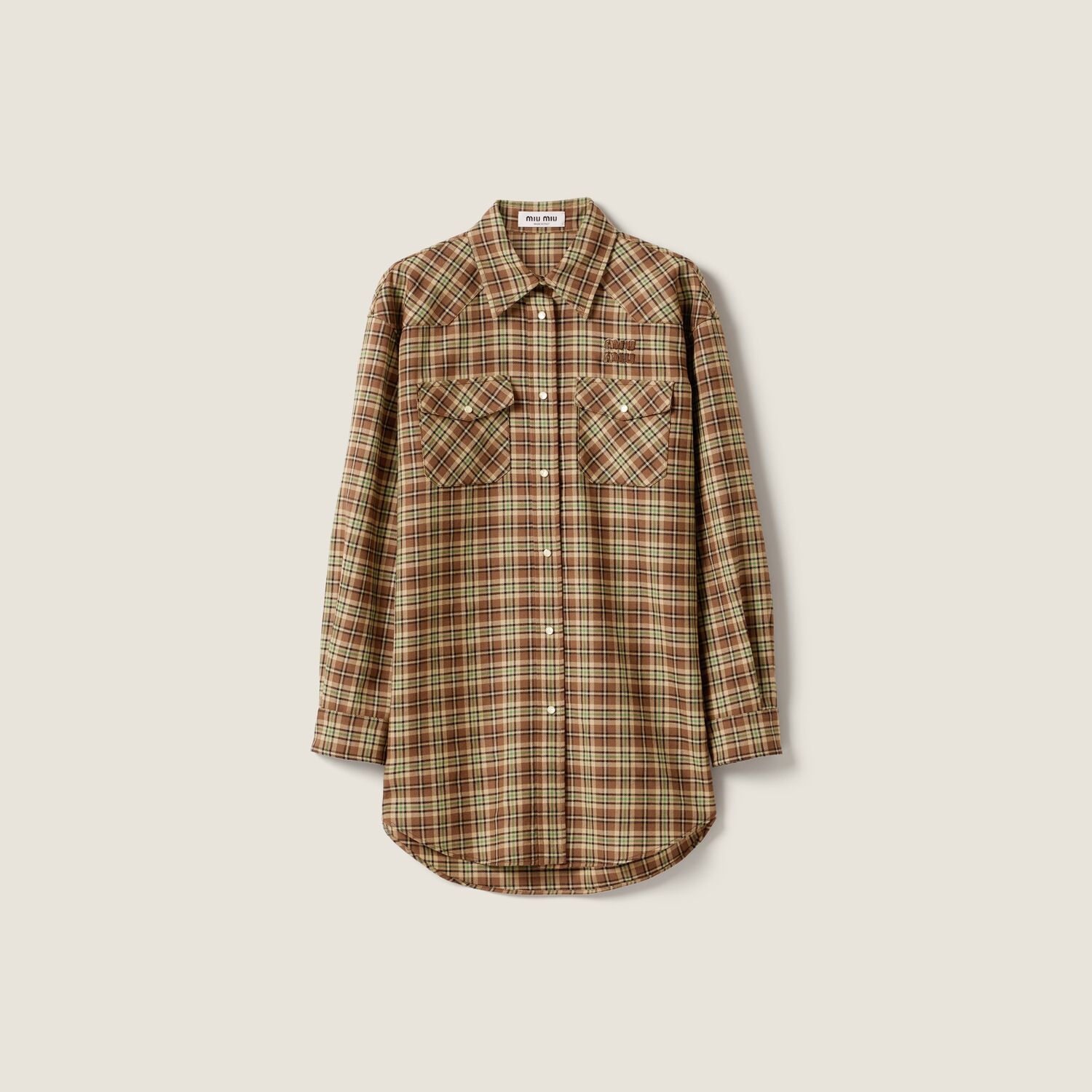 Эта рубашка отражает эксперименты Miu Miu с мужским стилем: клетчатый узор в винтажном настроении, свободный крой и вышитый тональный логотип с буквами определяют культовую, современную индивидуальность.