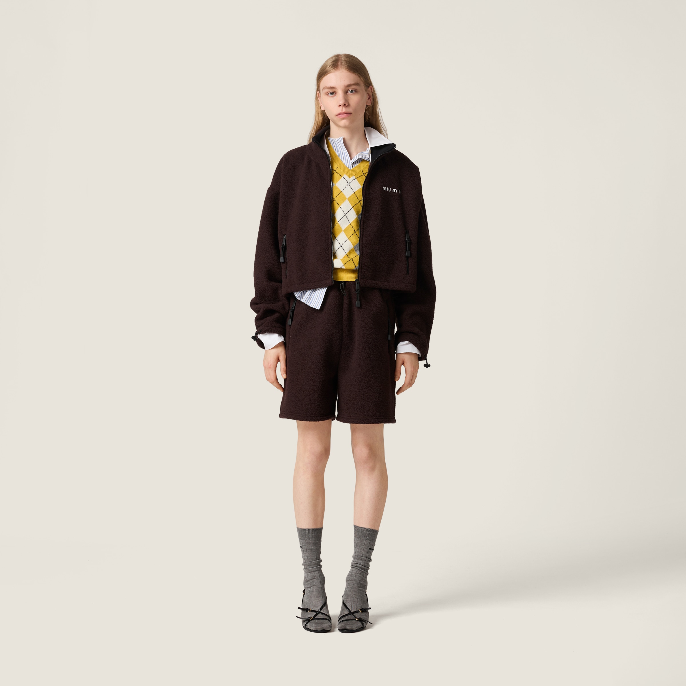 Ромбовидный узор придает этой мягкой кашемировой жилетке игривую утонченность, переосмысливая классическую вещь в соответствии с изысканным и современным взглядом Miu Miu.
