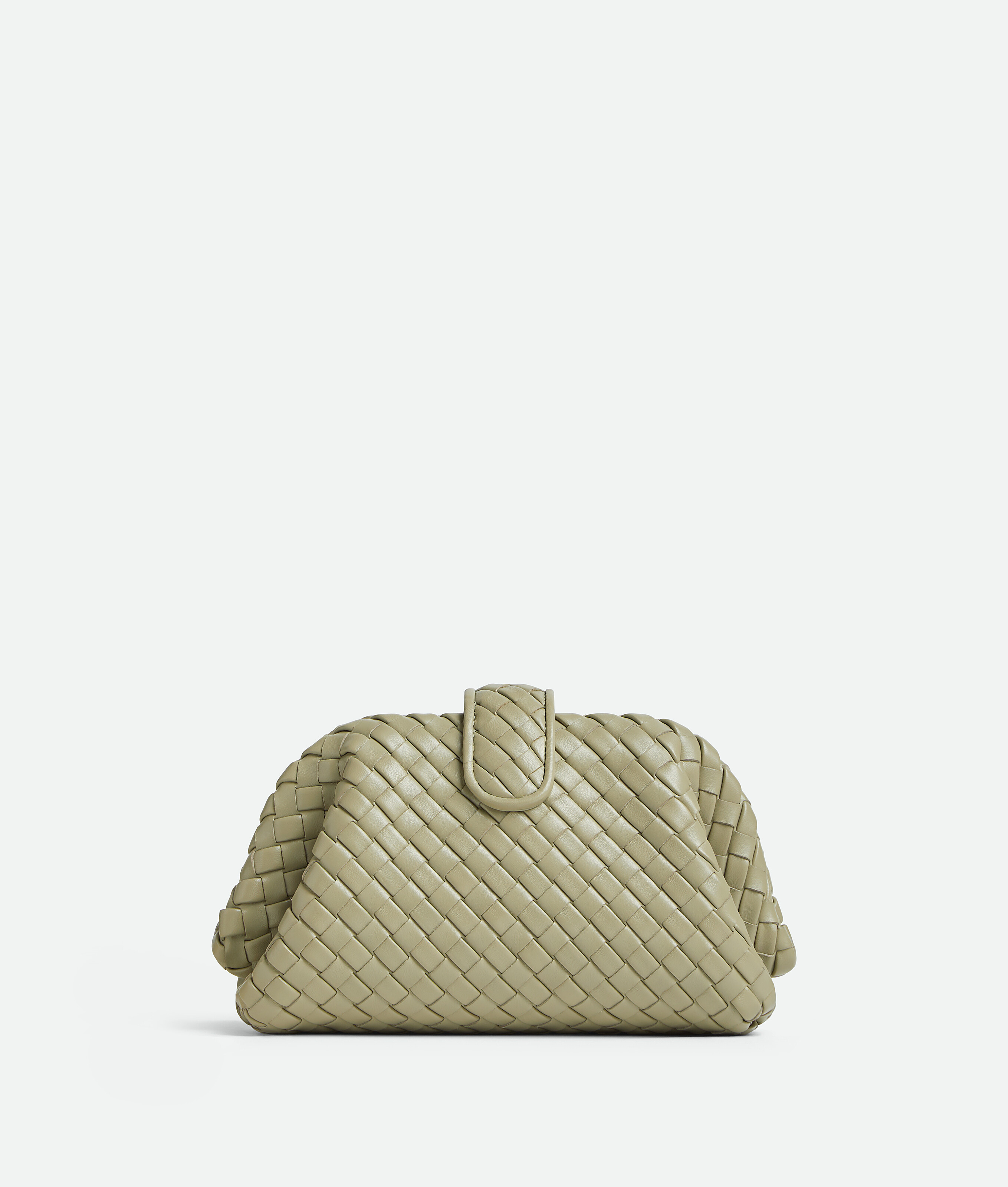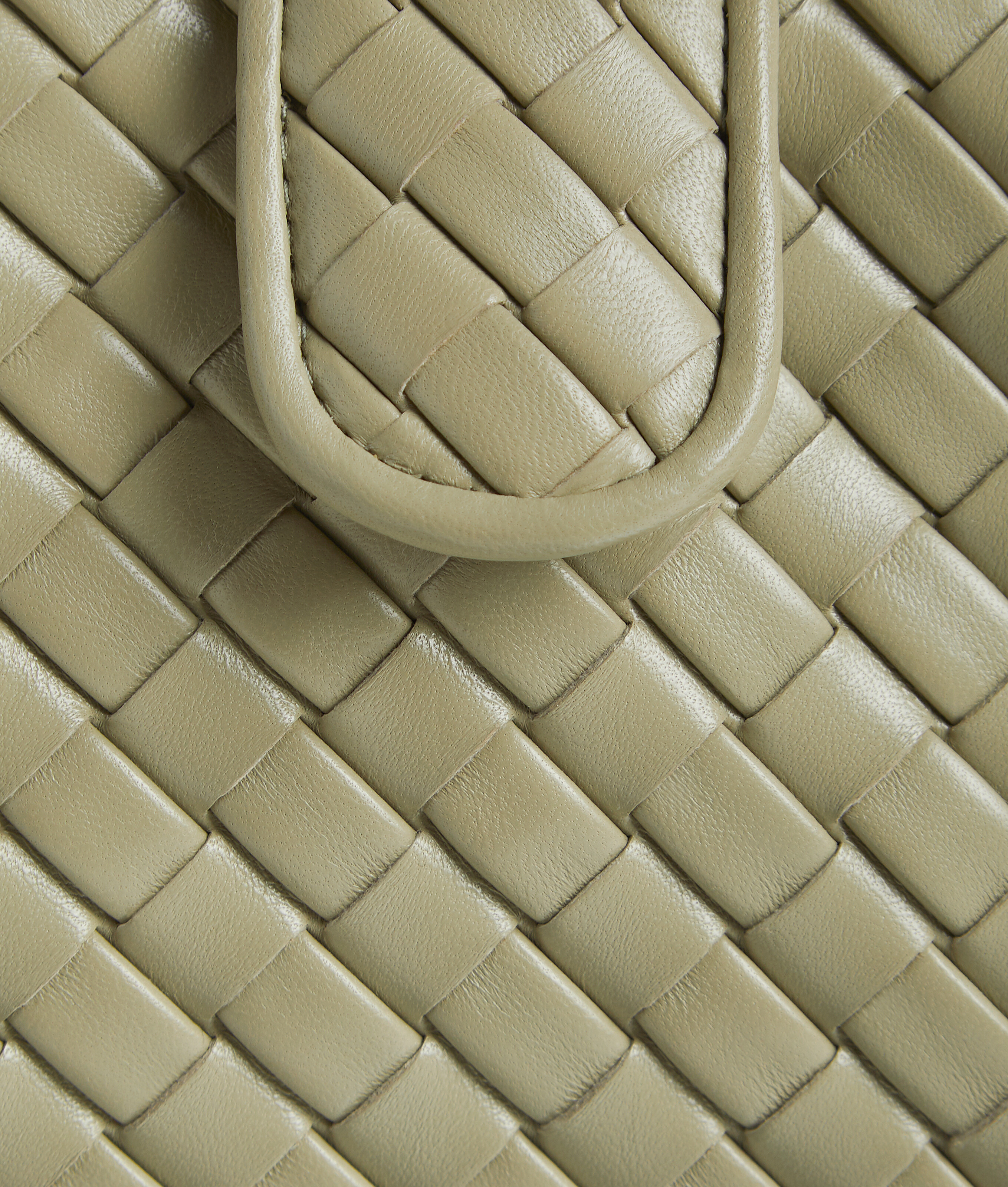 • Маленькая мини-клатч с мягкой интреччатой кожей с переплетенной кожаной цепочкой через плечо