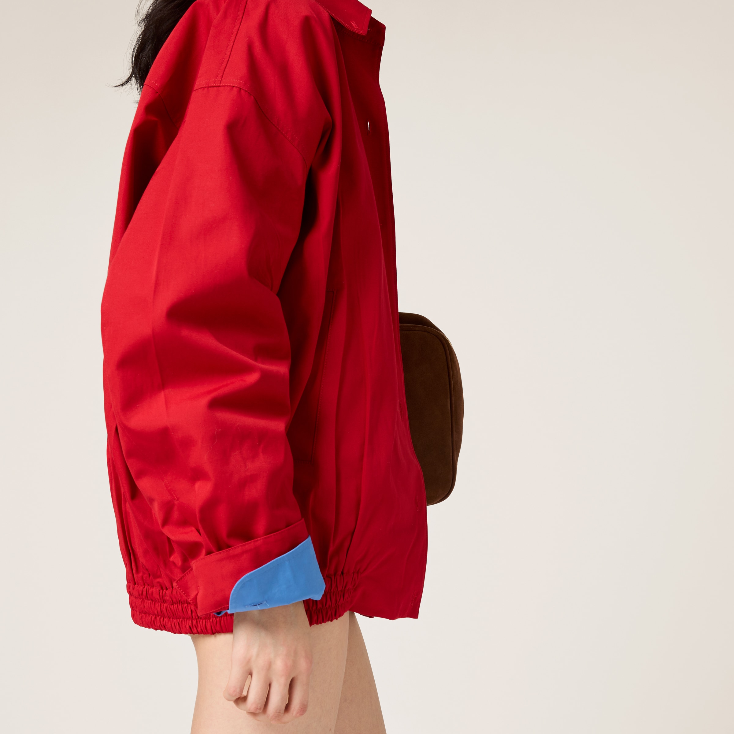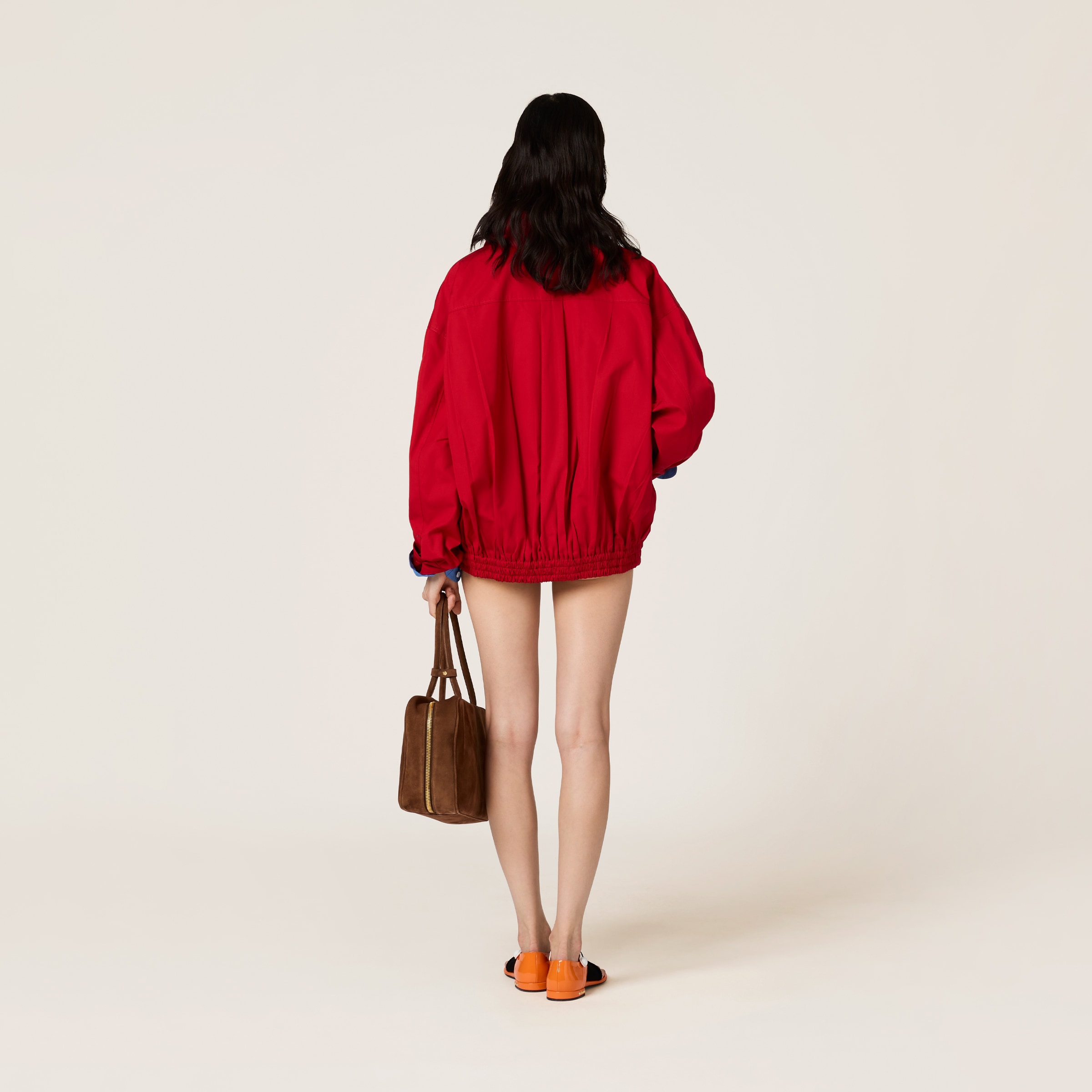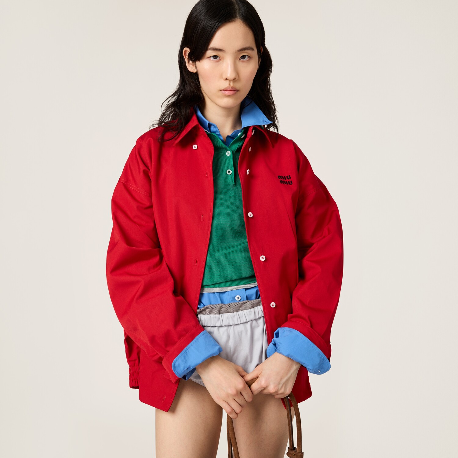 Знаковая рубашка из хлопкового поплина с застежкой на пуговицы переосмыслена в силуэте этого блузона, который приобретает свежий и оригинальный характер, играя с элементами рубашечного стиля и кодами гардероба Miu Miu.