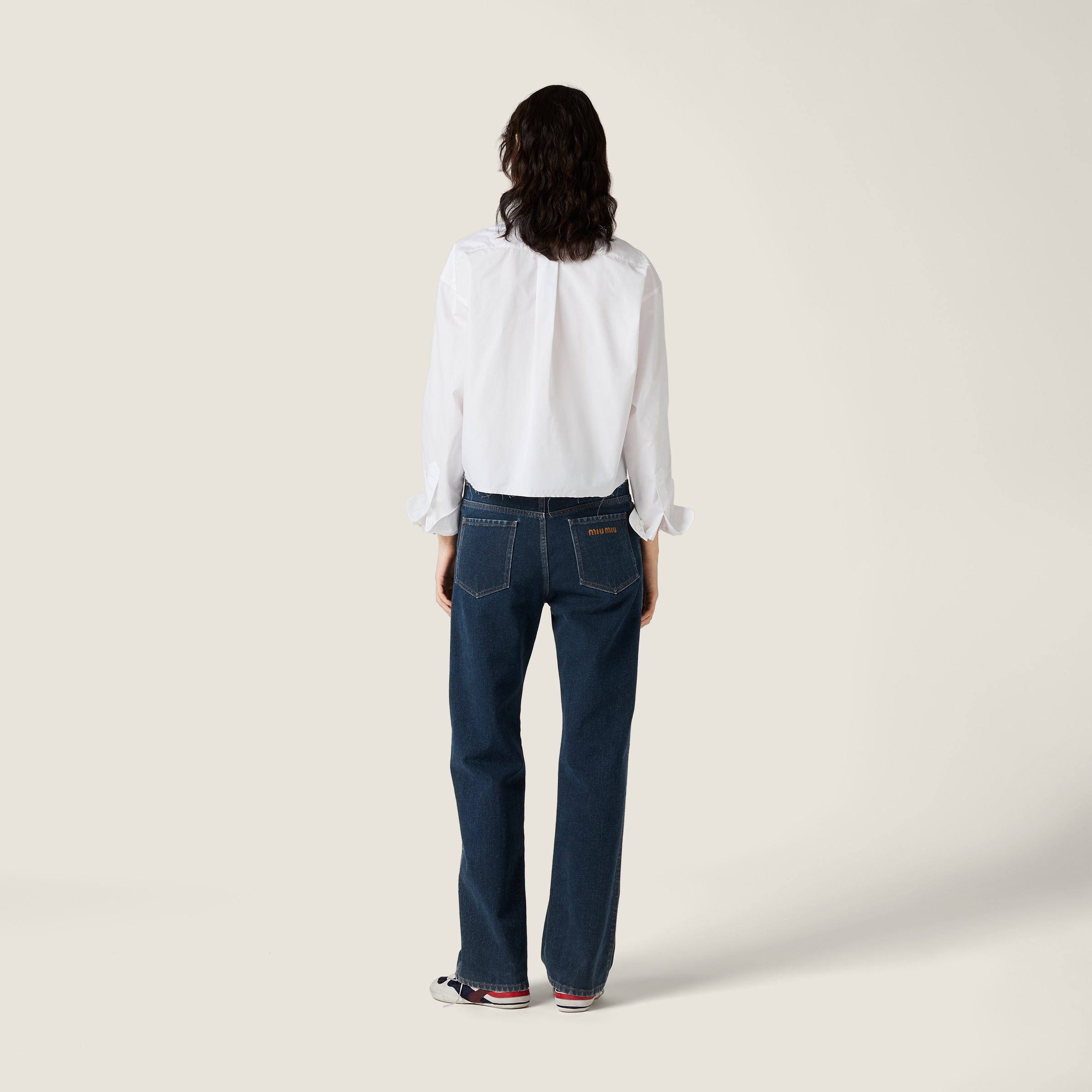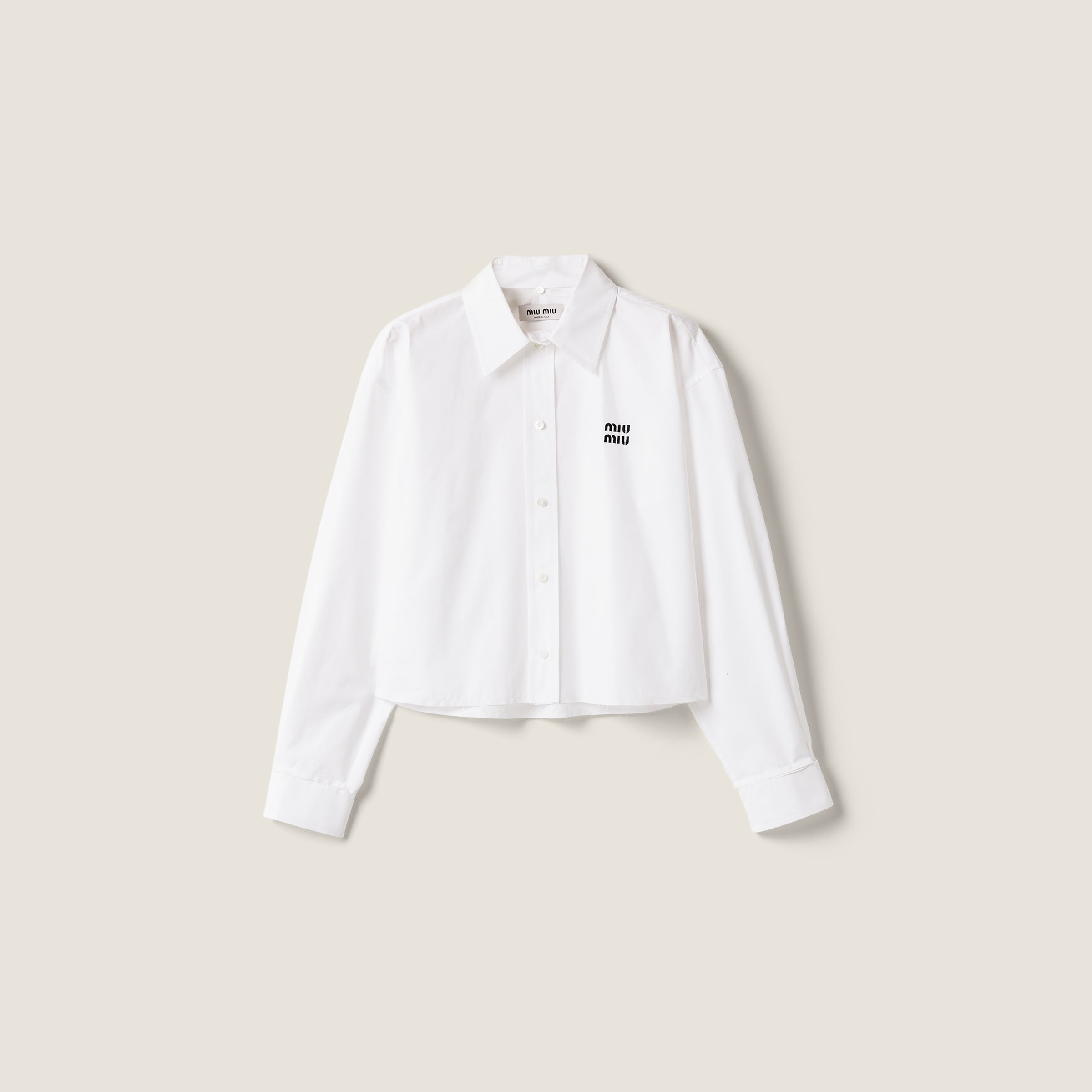 Классическая мужская рубашка переосмысляется в этой модели из поплина с слегка укороченным кроем, дополненной съемными воротником и манжетами, которые придают характер и универсальность этой иконе гардероба Miu Miu.