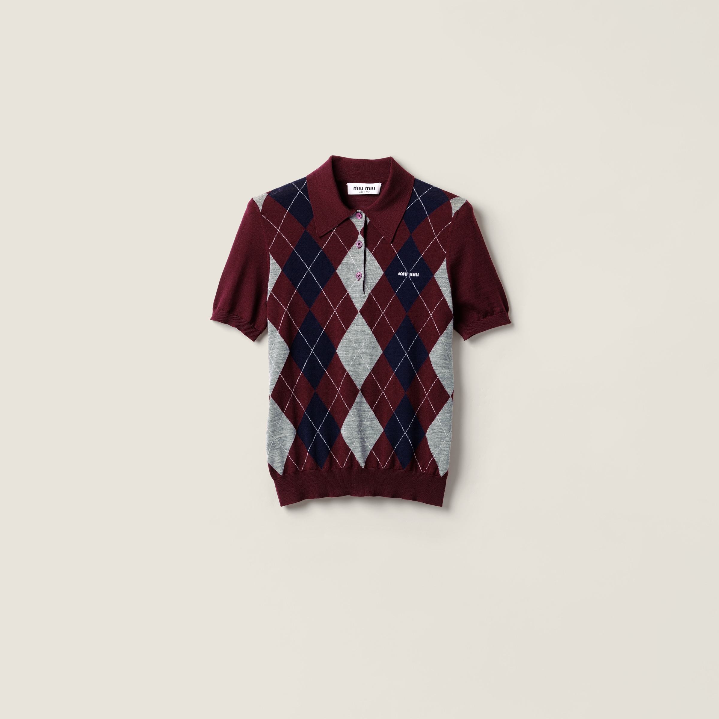 Ромбовидный узор придает легкость и графичность изысканному исполнению этого вязаного шерстяного поло, которое переосмысляет классическую вещь в соответствии с современным взглядом Miu Miu.