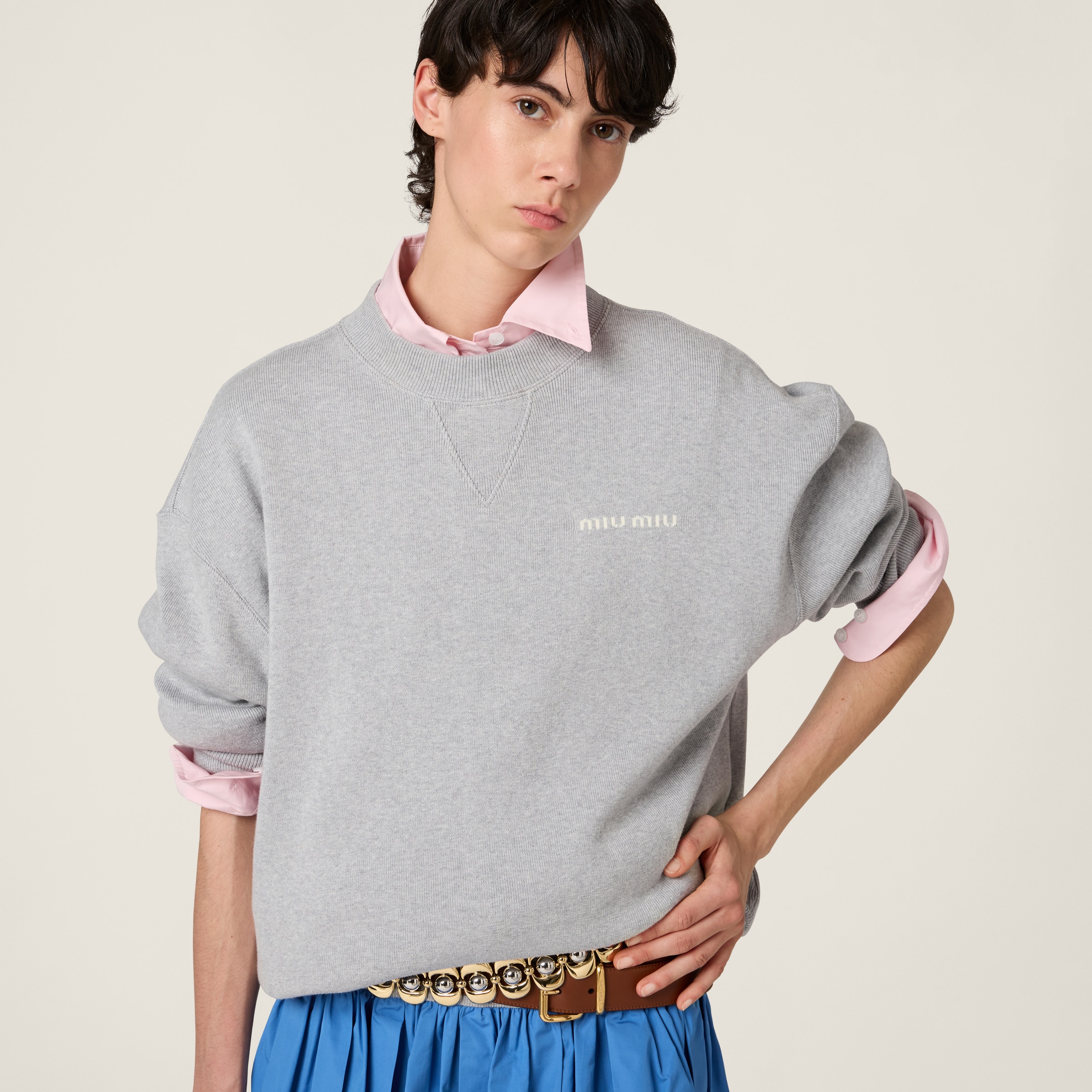 Знаковый гардероб Miu Miu получает новое сезонное воплощение в этом свитшоте из хлопкового флиса свободного кроя с интарсийным логотипом, который придает универсальным образам дух лайфстайла.
