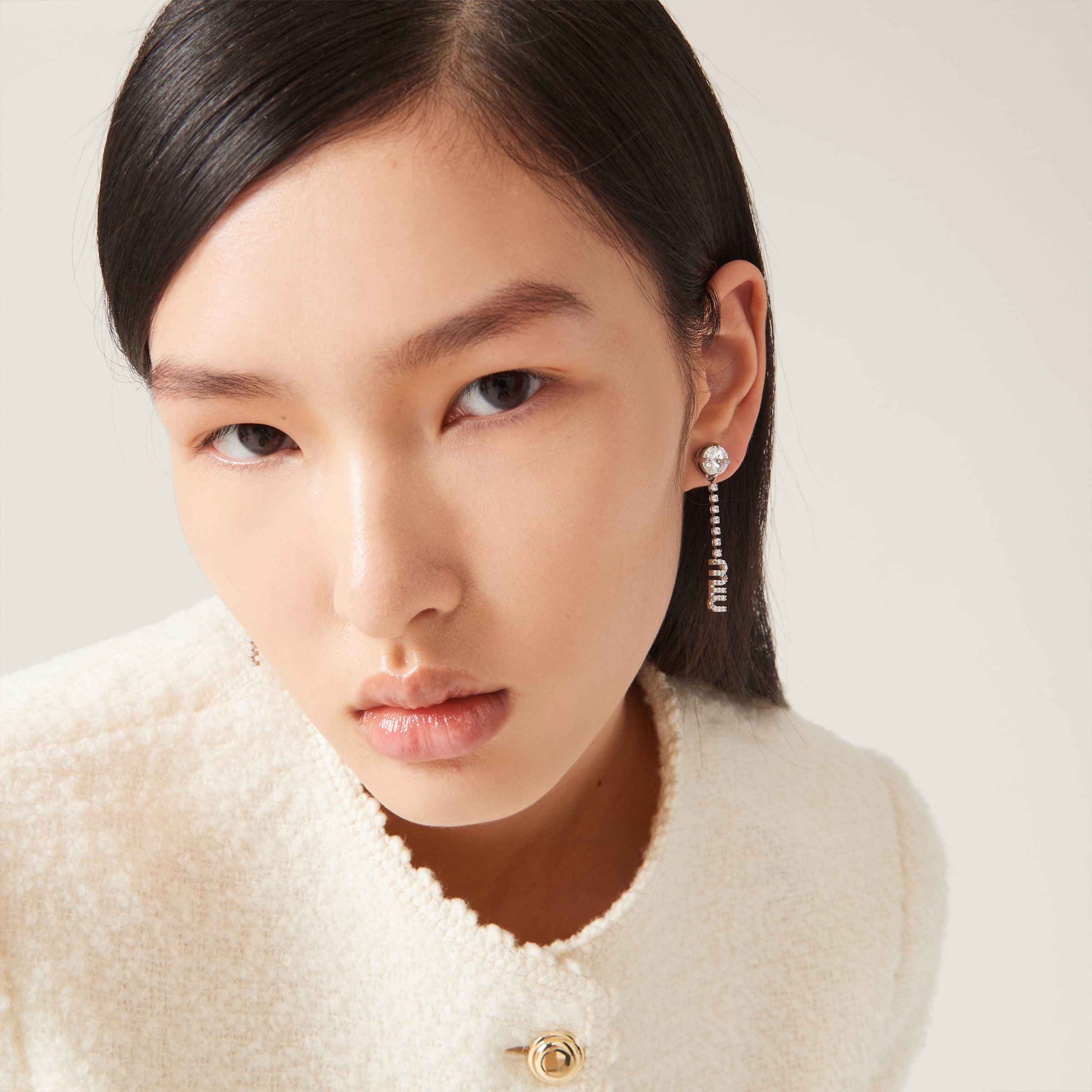 Miu Miu переосмысляет классические серьги-подвески, сочетая фирменный логотип и игривую женственность. Искусственные кристаллы придают изысканное мерцание, завершая украшение утонченным акцентом.