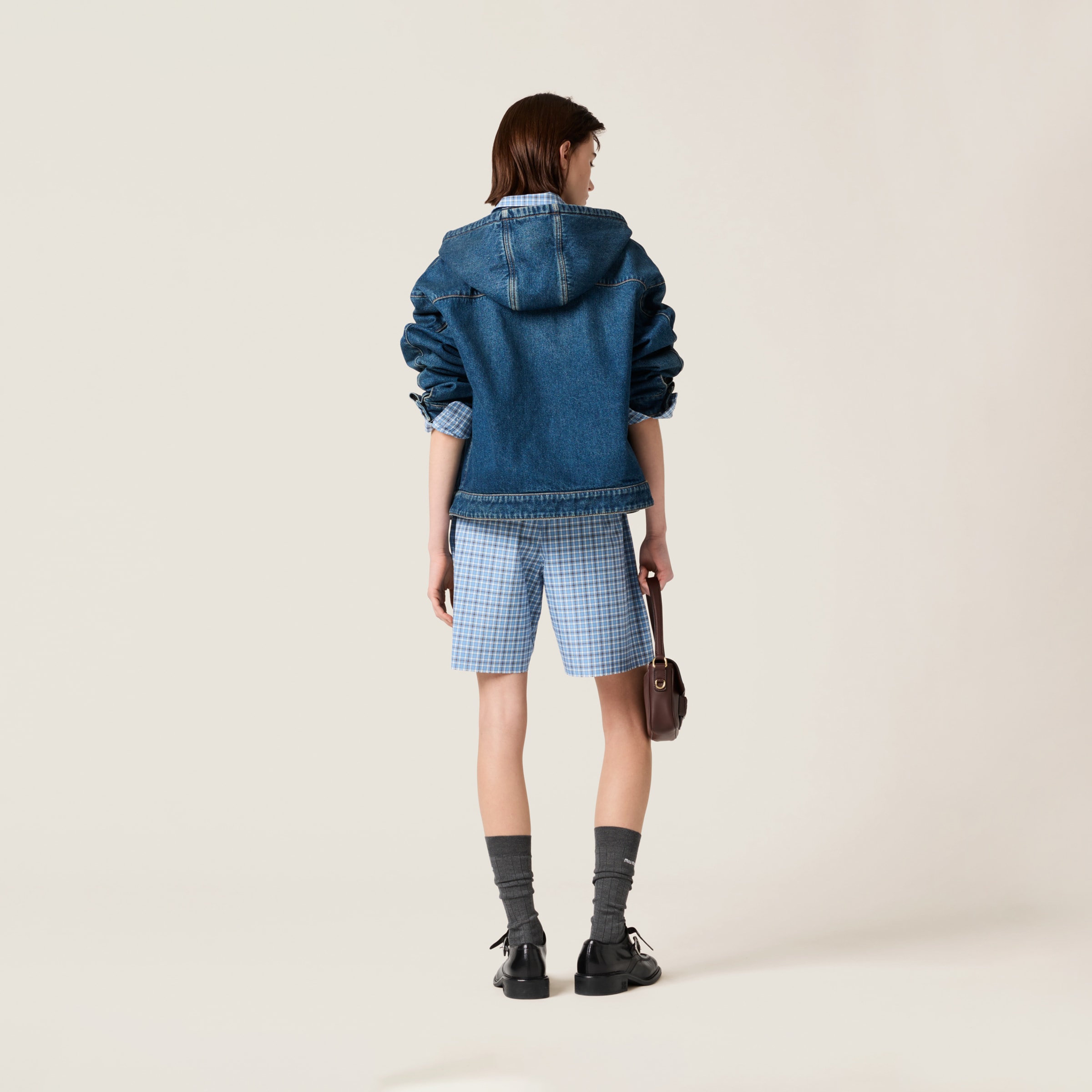 Знаковая худи Miu Miu переосмыслена в классическом темно-синем дениме для этой стеганой куртки с капюшоном, сочетающей в себе повседневную и винтажную эстетику.