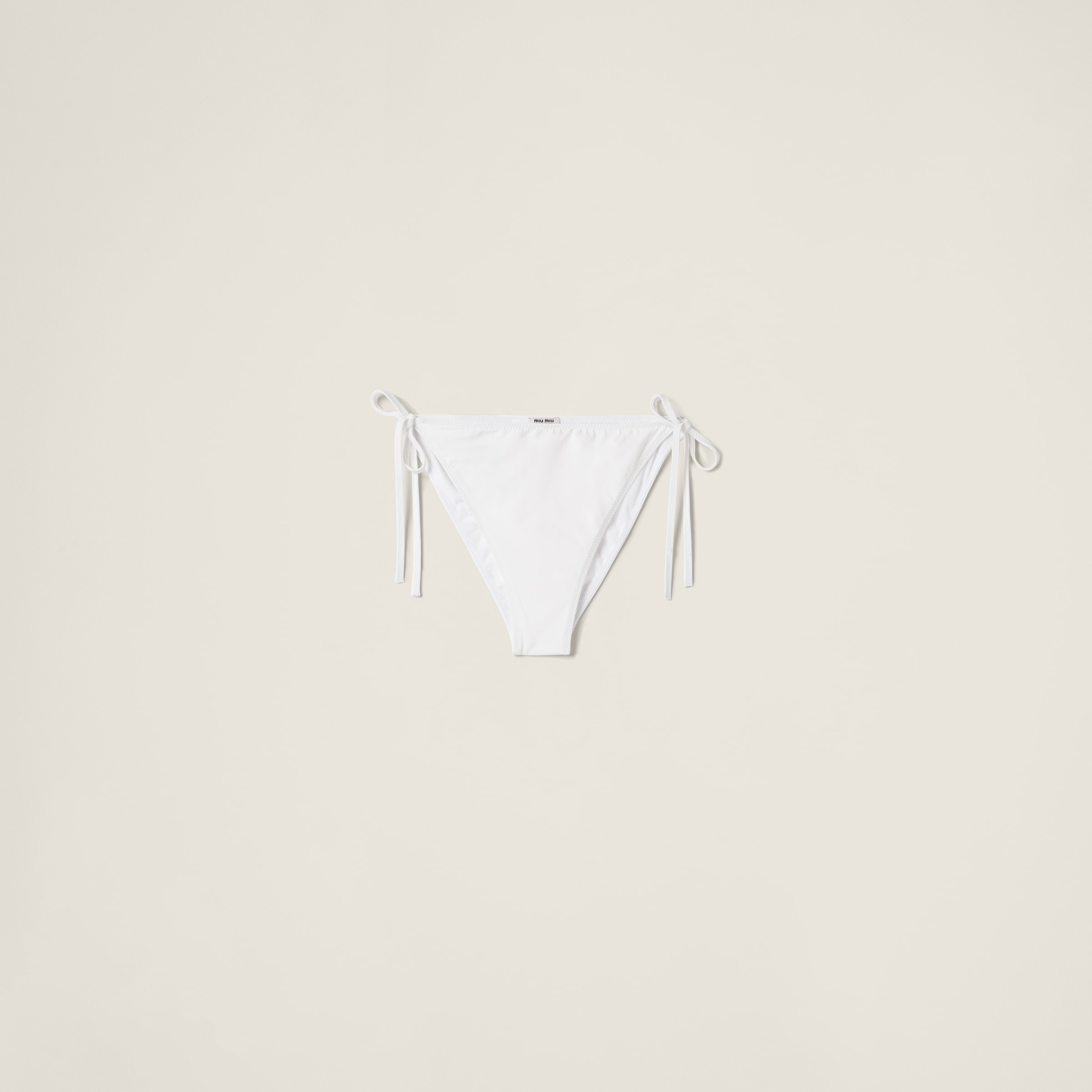 Легкая, мягкая, плотная и износостойкая текстура джерси сочетается с изящными завязками по бокам этого трусика. Модель, которую можно носить как низ от купальника или использовать для создания стильных образов сезона, украшена фирменным логотипом Miu Miu на бирке, добавляющим культовый акцент.