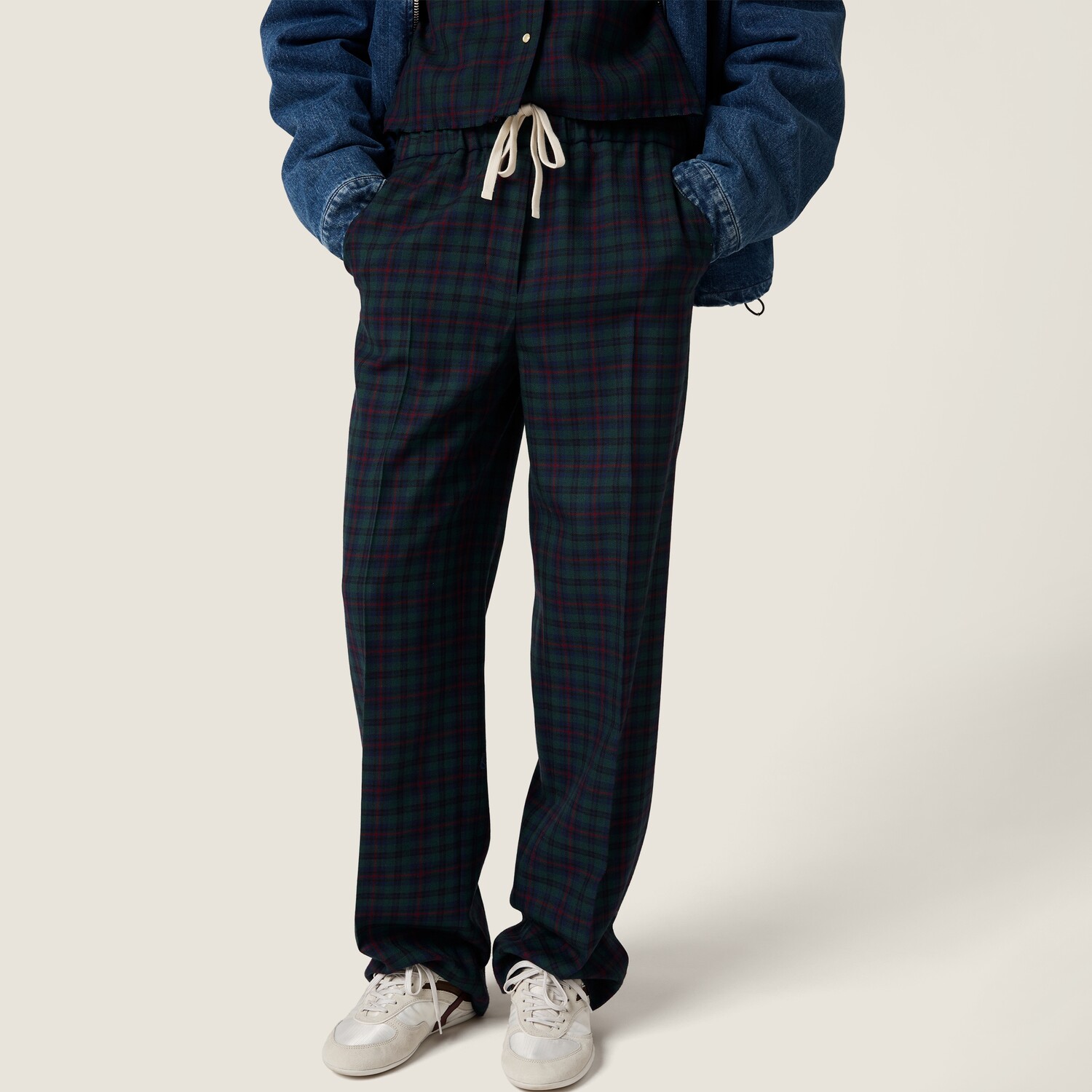 Эти клетчатые брюки переосмысливают классические законы стиля с добавлением спортивных элементов. Конструкция, вдохновленная спортивными брюками, придает изделию непринужденный, современный характер, сохраняя его уникальное, утонченное очарование.