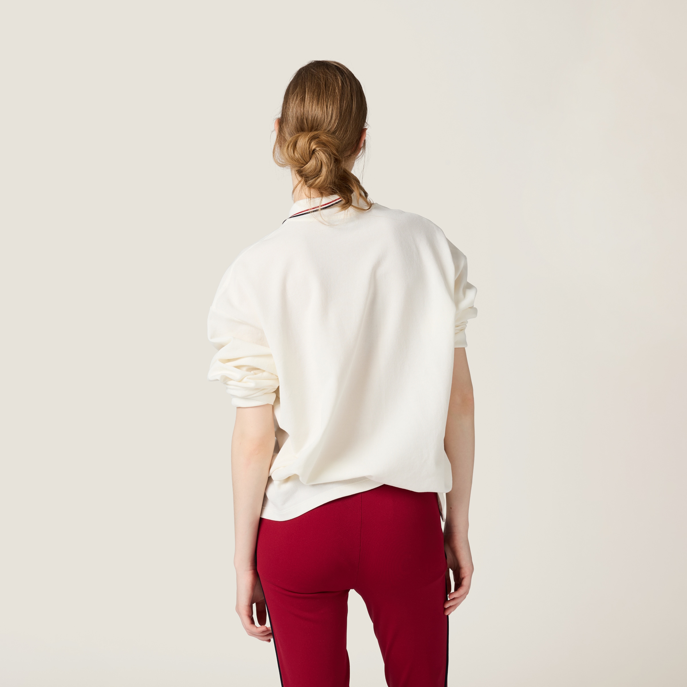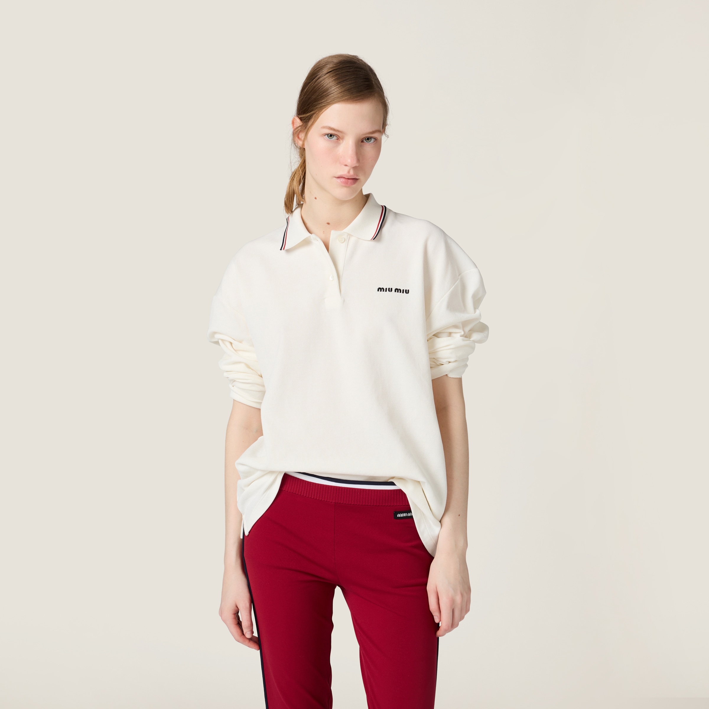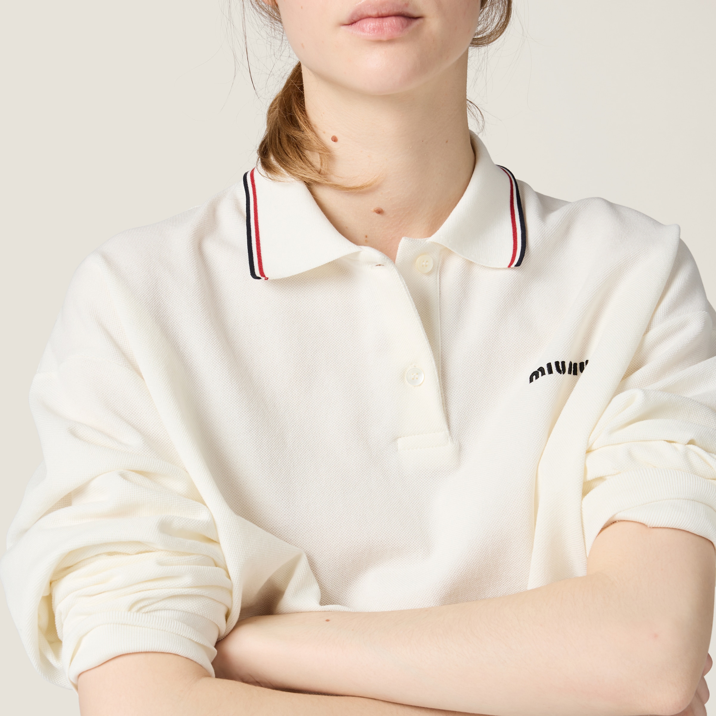 Классическая футболка-поло из пике переосмыслена в стиле Miu Miu и выделяется своим повседневным, преппи-вдохновленным дизайном, ставшим культовым благодаря вышитому логотипу Miu Miu.