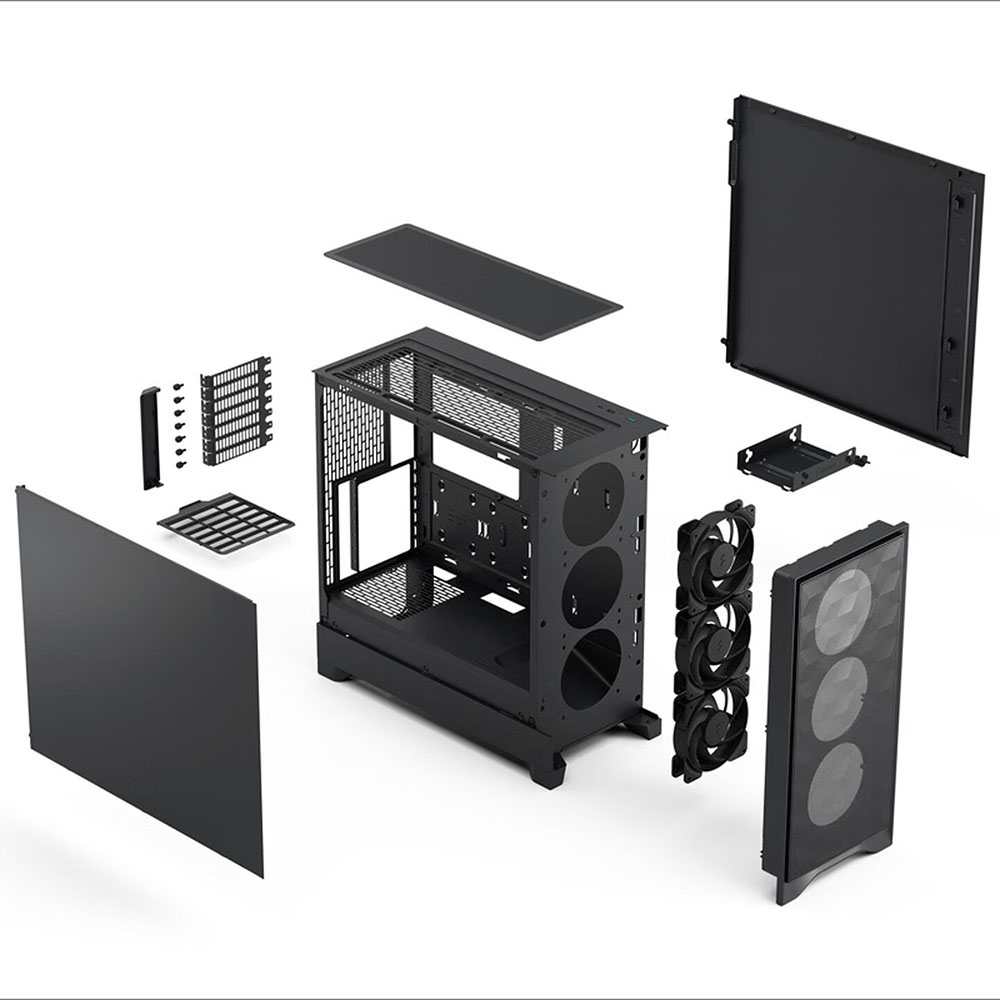 Fractal Design Pop 2 Air представляет собой продуманный, эргономичный и хорошо продуваемый корпус, который совместим с материнскими платами ATX, mATX и Mini-ITX. В комплекте с корпусом поставляется 3 кулера 120 мм каждый для передней панели. Внутреннее пространство позволяет комфортно устанавливать комплектующие, а для накопителей предусмотрено три слота - один для 3.5''/2.5'' и два для 2.5''. В модели можно установить суммарно до 7 вентиляторов 120 мм, а верхняя и задняя панели позволяют установить СЖО до 360 мм для верхней и до 120 мм для задней панели. Максимально допустимая длина БП может составлять 180 мм, длина видеокарты - до 416 мм, а высота процессорного кулера - до 170 мм.