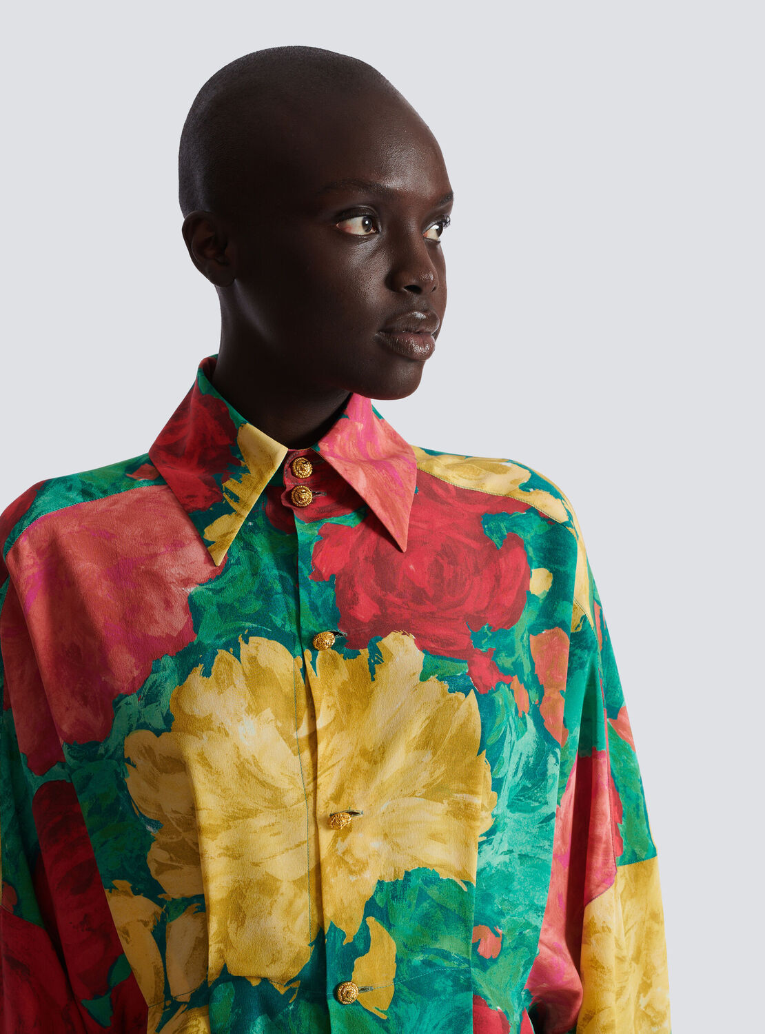 Креповое платье-рубашка с принтом из роз Balmain, мультиколор
