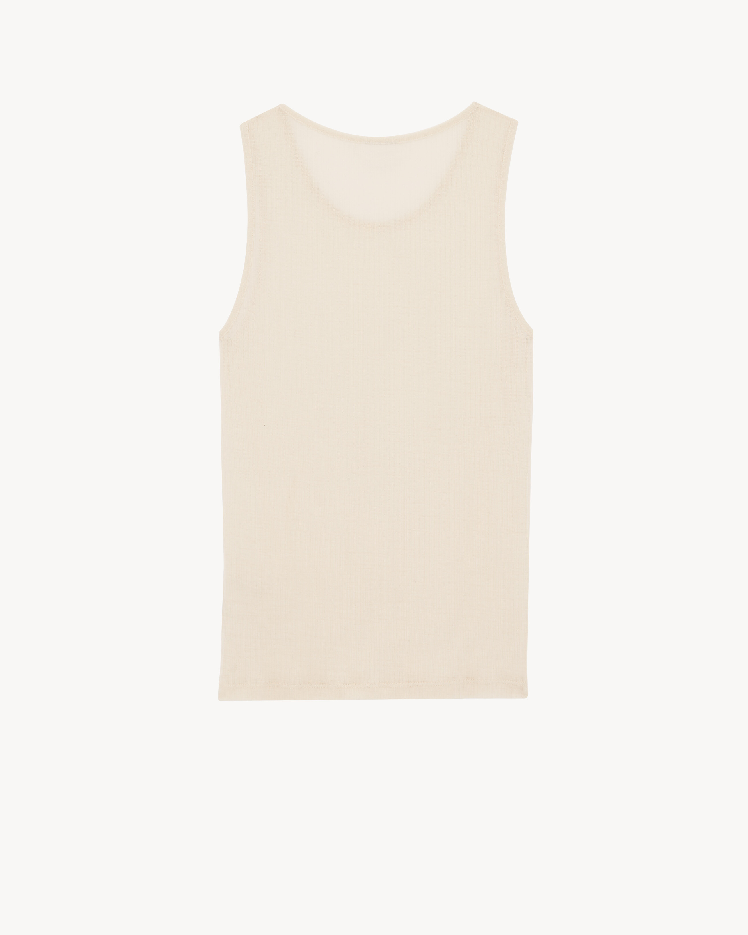Полупрозрачная ребристая майка с круглым вырезом и вышивкой Cassandre на груди.