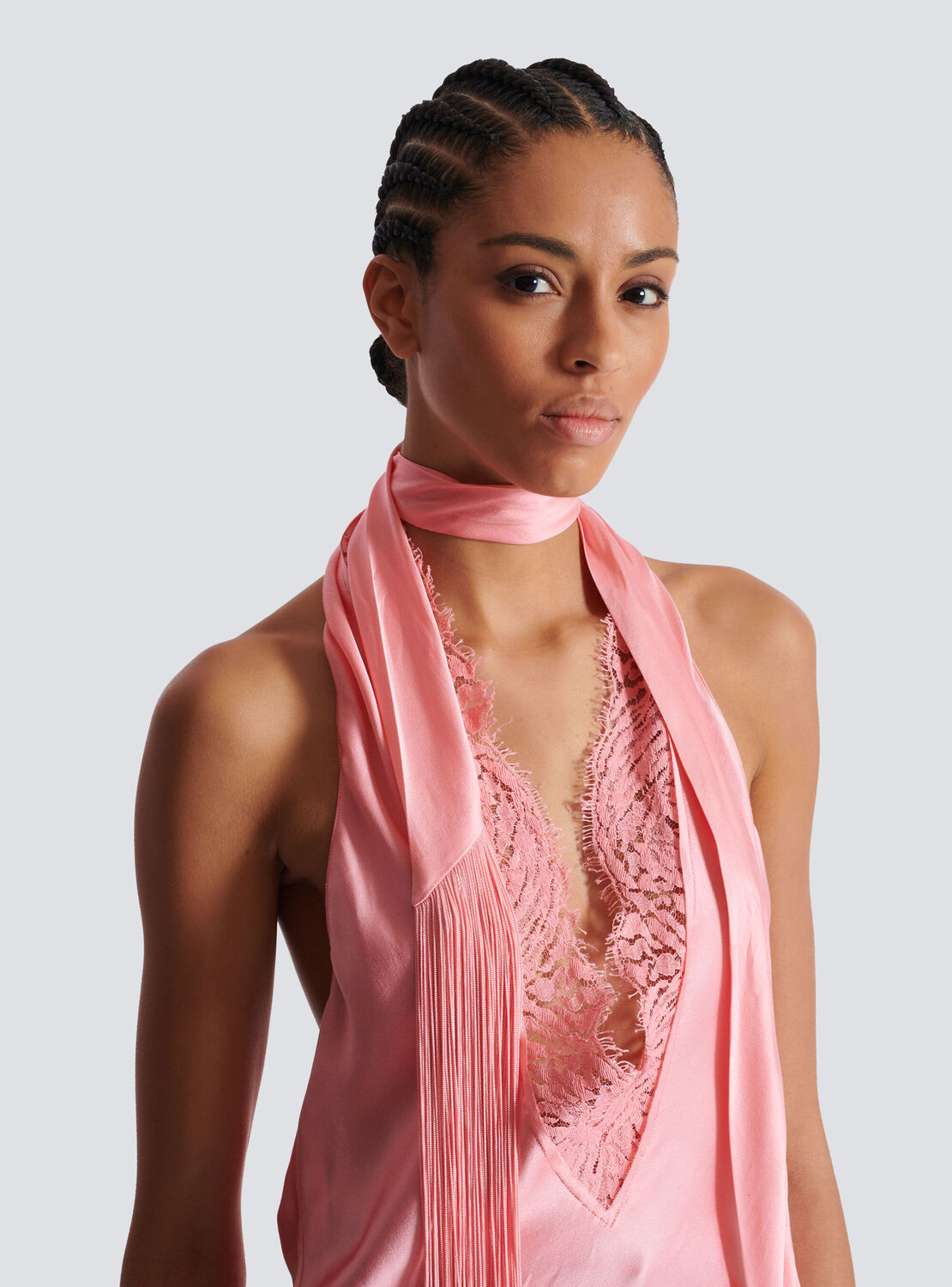 Атласный топ без спинки с бахромой Balmain, синий/розовый 67 474₽