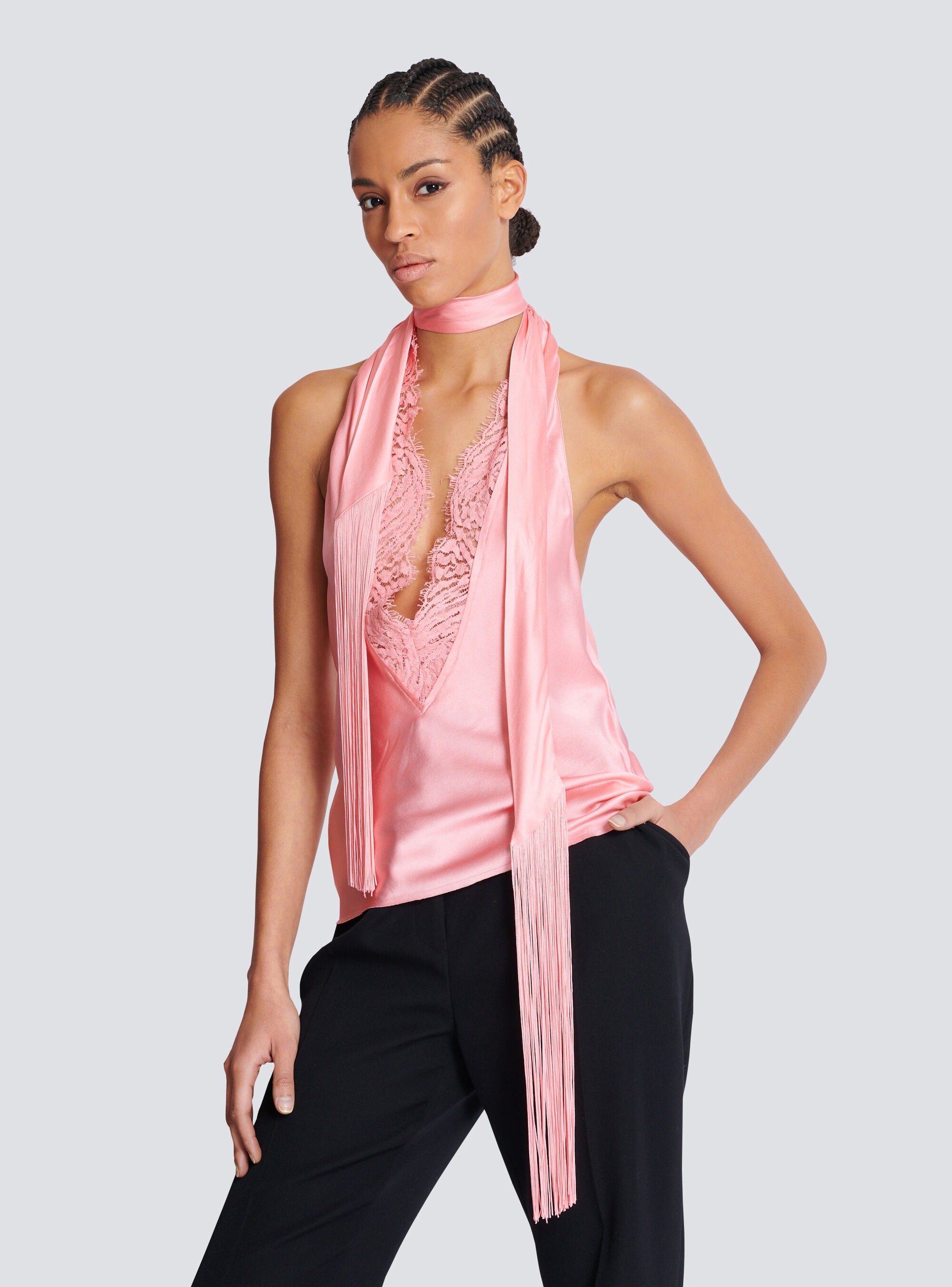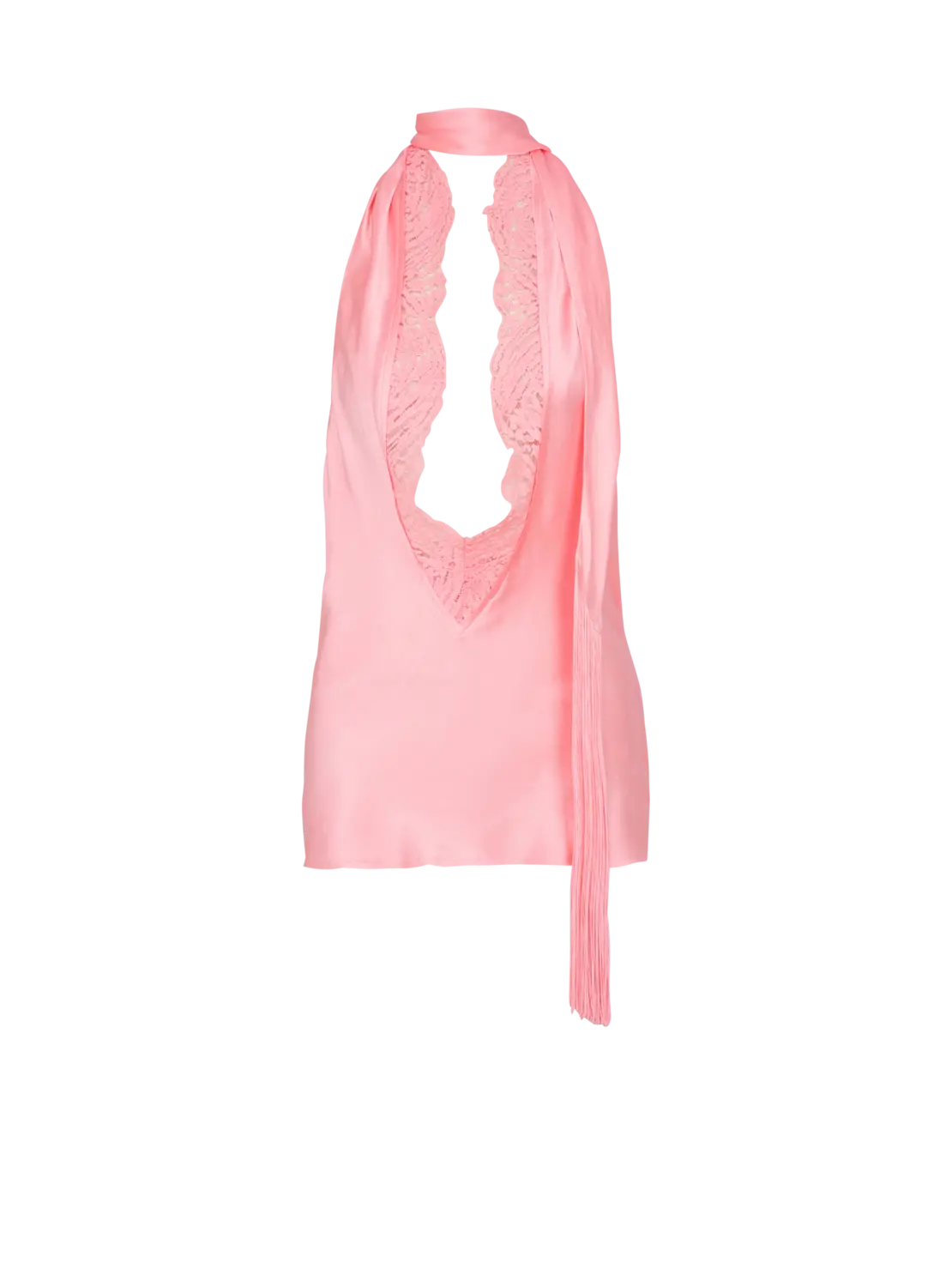 Атласный топ без спинки с бахромой Balmain, синий/розовый