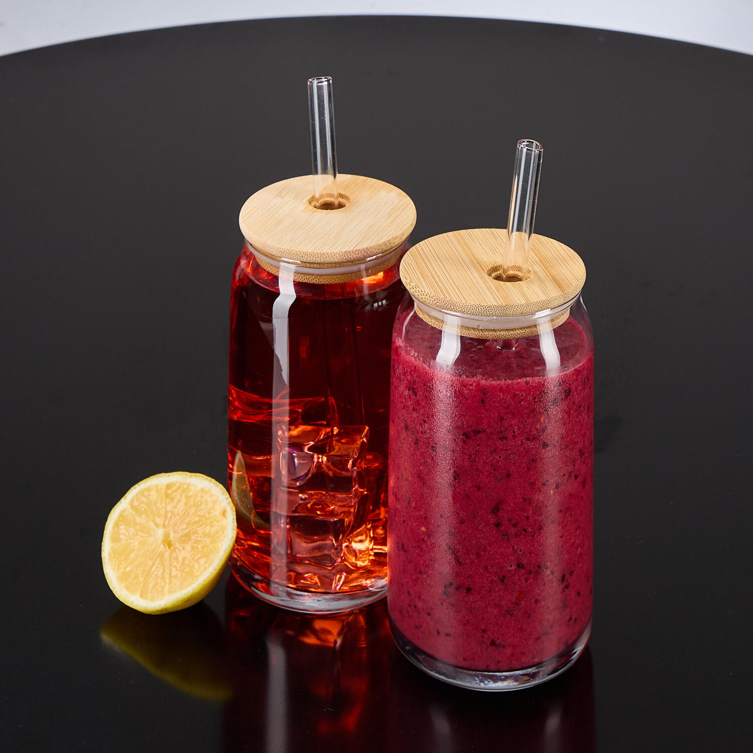 - Декоративные стаканчики в форме банки с бамбуковыми крышками и стеклянными трубочками