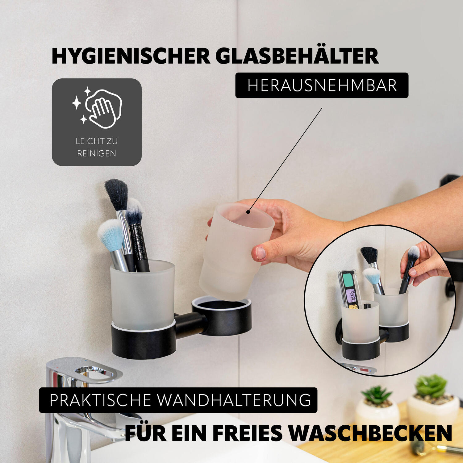 Благодаря входящему в комплект круглому настенному кронштейну подстаканник легко и надежно крепится на стену. Это освобождает место у раковины, поддерживает порядок и обеспечивает надежное хранение зубных щеток и других туалетных принадлежностей - для ванной комнаты без беспорядка.