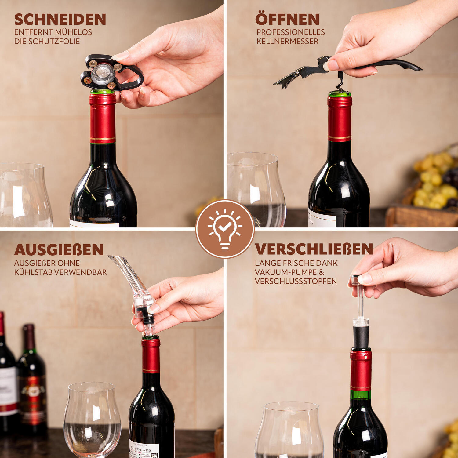 Если вы хотите дать открытому вину постоять несколько дней, в комплект также входит вакуумный насос. Он удаляет воздух из вина, предотвращая окисление. Просто качайте до тех пор, пока не почувствуете сопротивление. Затем насос плотно закроет бутылку. Открывалка для бутылок дополняет набор. Приложите фольгу к горлышку бутылки, слегка надавите, и верхняя часть фольги отклеится. Для более толстой фольги в набор входит нож сомелье, который также можно использовать для извлечения пробки из бутылки.