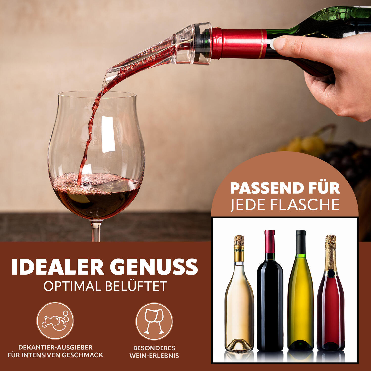 Ваш новый набор для разлива вина включает в себя прозрачный носик-декантер с защитным ободком от капель. По мере того, как вино проходит через него, оно аэрируется, ускоряя раскрытие его аромата в вашем бокале. Ничто не помешает вам наслаждаться вином в спокойной обстановке! Подходит как для красных, так и для белых вин.