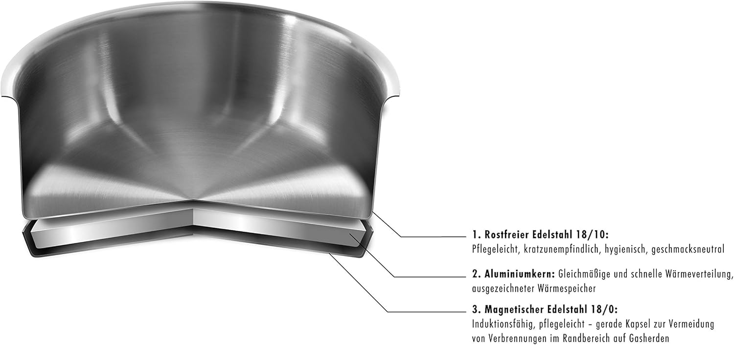 Энергосберегающее приготовление пищи: равномерное и быстрое распределение тепла, а также оптимальное сохранение тепла благодаря алюминиевому сердечнику и плотно закрывающимся плоским стеклянным крышкам.