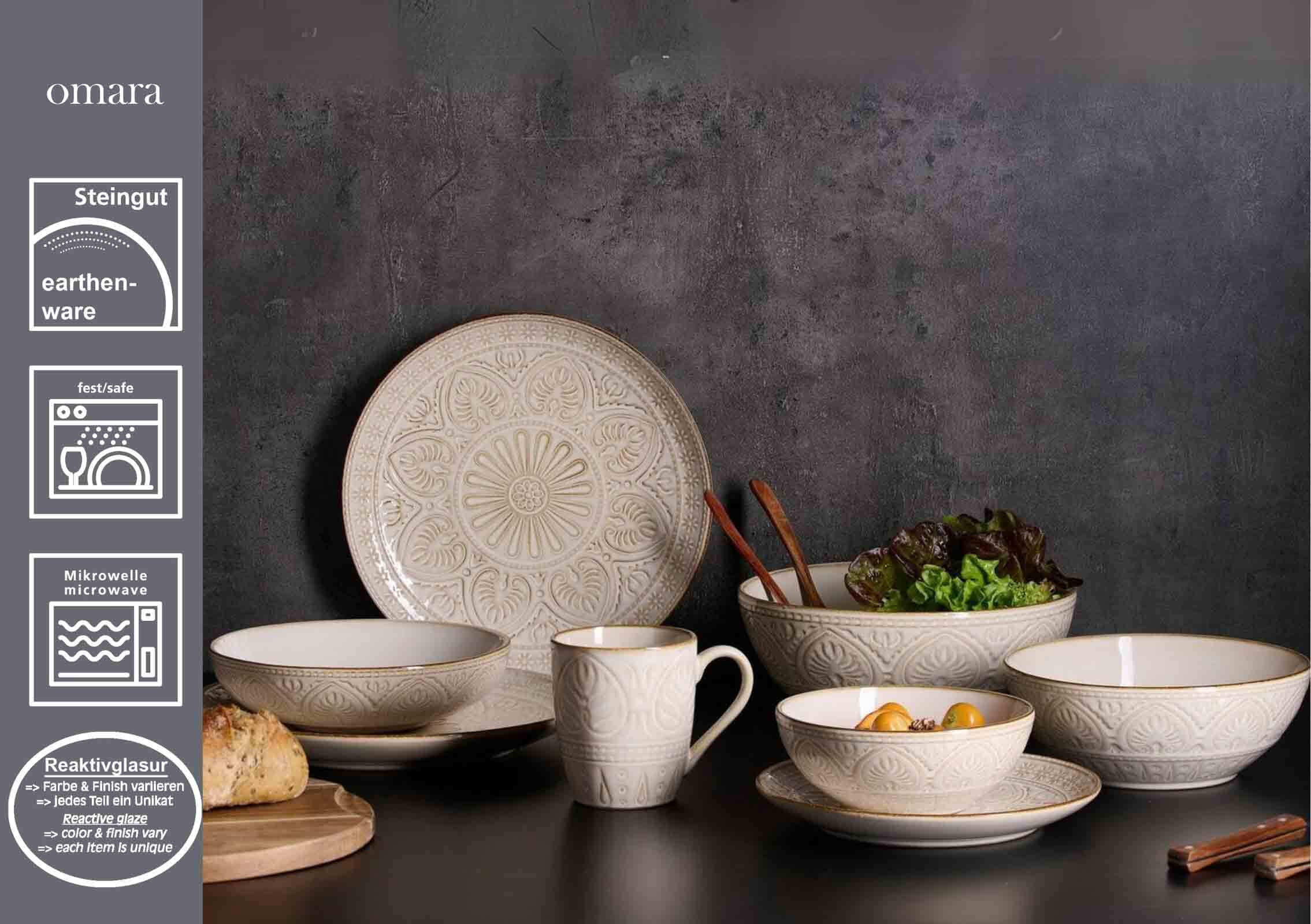 Как будто из «Тысячи и одной ночи»: благодаря великолепному рельефному орнаменту, Omara привносит восточный колорит на ваш стол. В отличие от часто красочных традиционных восточных узоров, эта посуда представлена в простых песочных тонах с очаровательным состаренным видом. Этот особый вид создается с помощью реактивной глазури, которая формирует индивидуальные цветовые градиенты и текстуры в процессе обжига, так что - как и в традиционном ремесле - нет двух одинаковых предметов посуды. Независимо от того, подаете ли вы типичные восточные блюда или простые повседневные обеды, эта искусно оформленная посуда позволит вам погрузиться в захватывающий мир Аладдина, Шахерезады, Али-Бабы и других с каждым приемом пищи.