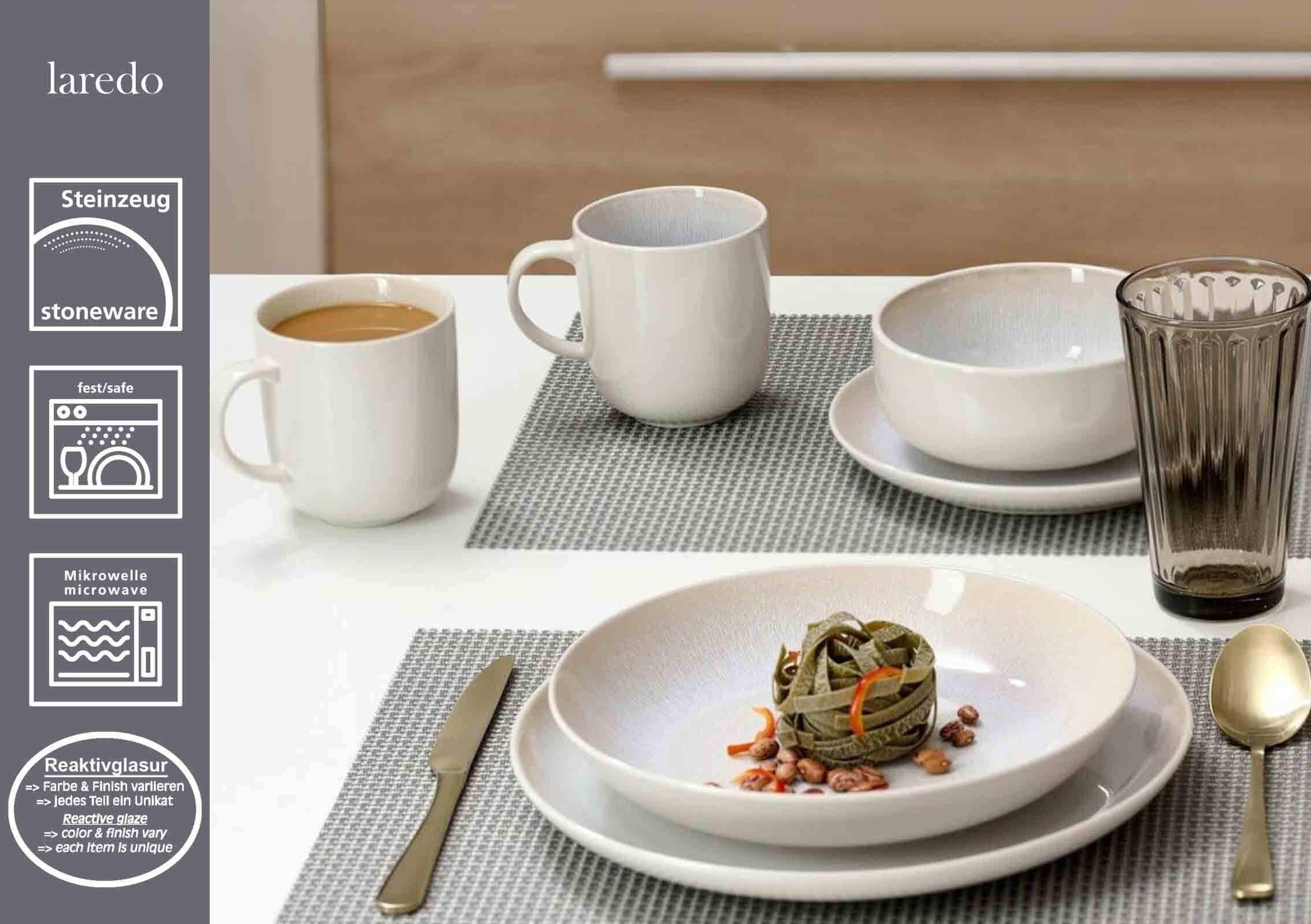 Чистота и утонченность: посуда Laredo впечатляет своей минималистичной, функциональной формой чаши и мягкой, меловой текстурой «тон в тон» на внутренней и верхней поверхностях изделий цвета слоновой кости. Эта текстура создается с помощью реактивной глазури, которая формирует индивидуальные цветовые градиенты и структуры в процессе обжига, поэтому, как и в традиционном ремесле, нет двух одинаковых изделий. Благодаря своему приятному простому дизайну, набор Lardeo обеспечивает расслабленную атмосферу за обедом и идеально вписывается в популярный скандинавский стиль.