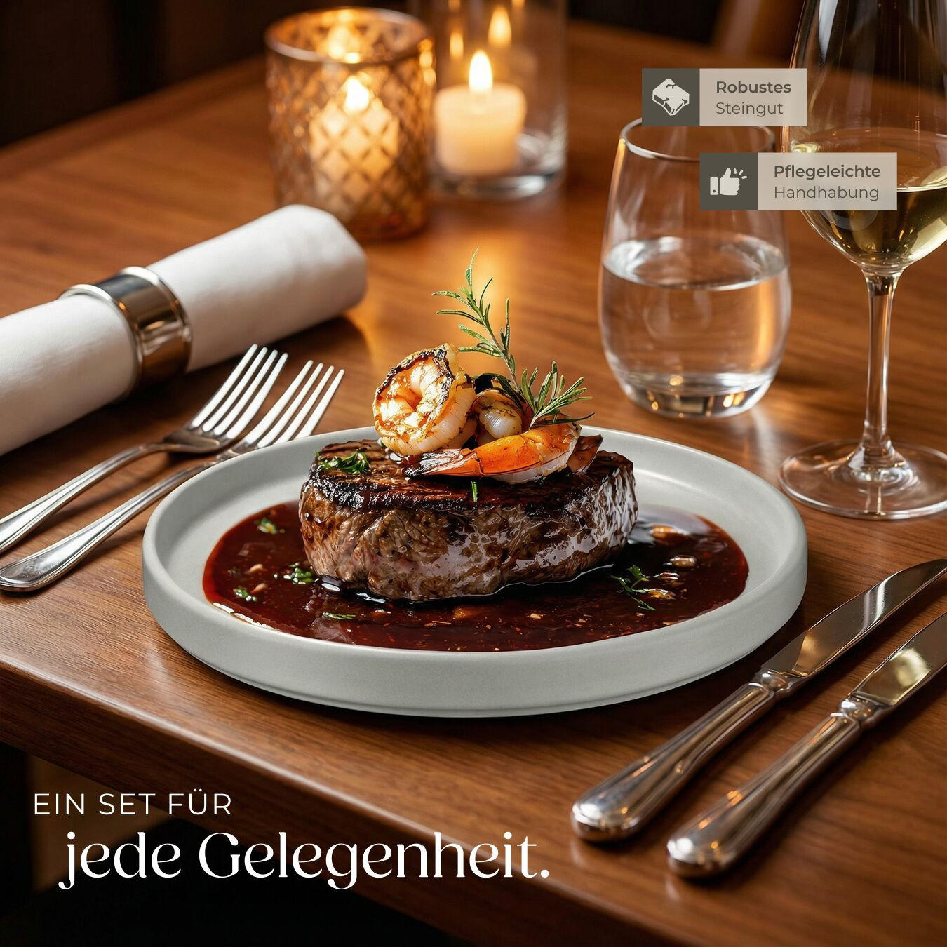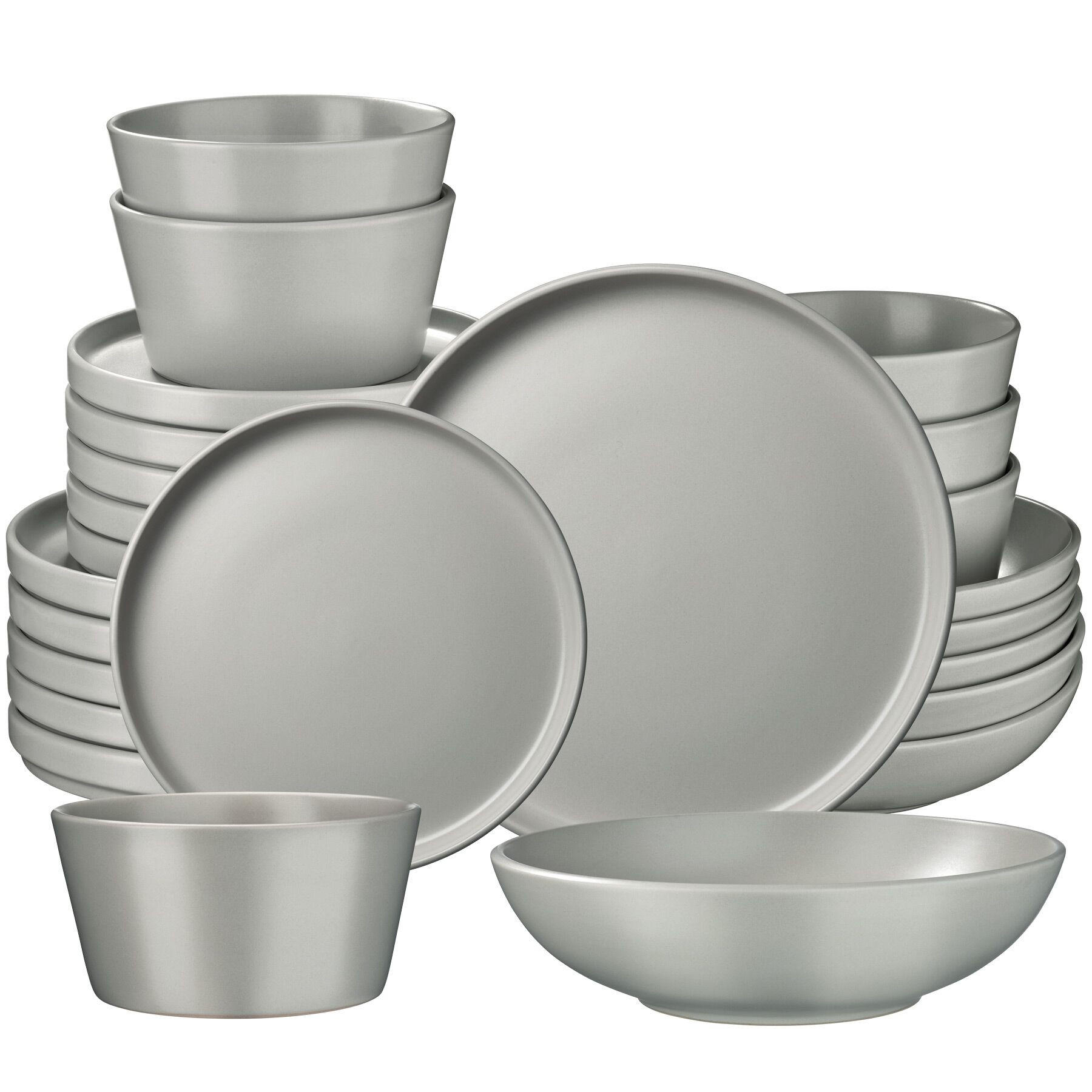 Еще одно преимущество этого набора посуды из каменной керамики - компактное хранение. Все предметы можно удобно складывать друг в друга, что обеспечивает особенно компактное хранение. Это не только практично, но и помогает сэкономить место на небольших кухнях. Это делает набор посуды Una идеальным для любой семьи, которая ценит функциональную и элегантную мебель. Основные характеристики: Универсальный набор посуды на 6 персон; Современный городской дизайн; Прочная глазурованная керамика для долговечности; Можно мыть в посудомоечной машине и использовать в микроволновой печи; Компактное хранение благодаря возможности штабелирования. Технические характеристики: Большая тарелка: Габаритные размеры (ØхВ): ок. 26 x 2,3 см; Вес: ок. 860 г; Маленькая тарелка: Габаритные размеры (ØхВ): ок. 19,5 x 2 см; Вес: ок. 520 г. Тарелки: Габаритные размеры (ØхВ): ок. 20,5 x 5,2 смВес: ок. 550 г Миски: Габаритные размеры (ØхВ): ок. 15 x 7,4 смВес: ок. 550 г Материал: керамика