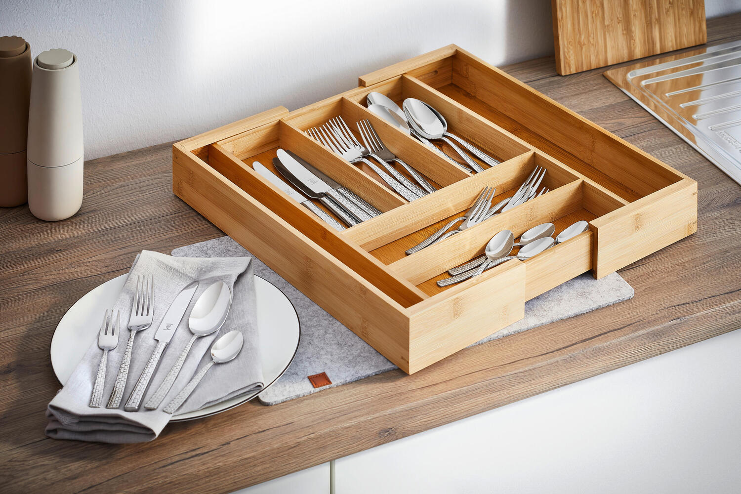 Наведите порядок в своих ящиках! Деревянный поднос для столовых приборов JUSTINUS с 7 отделениями позволяет легко и аккуратно разместить ножи, вилки и другие кухонные принадлежности. Элегантный бамбуковый материал выглядит особенно стильно. Поднос размером примерно 32 x 46 см можно выдвинуть до 56 см, что позволяет индивидуально настроить его под любой ящик. Создайте порядок с помощью этого привлекательного деревянного подноса для столовых приборов от JUSTINUS!