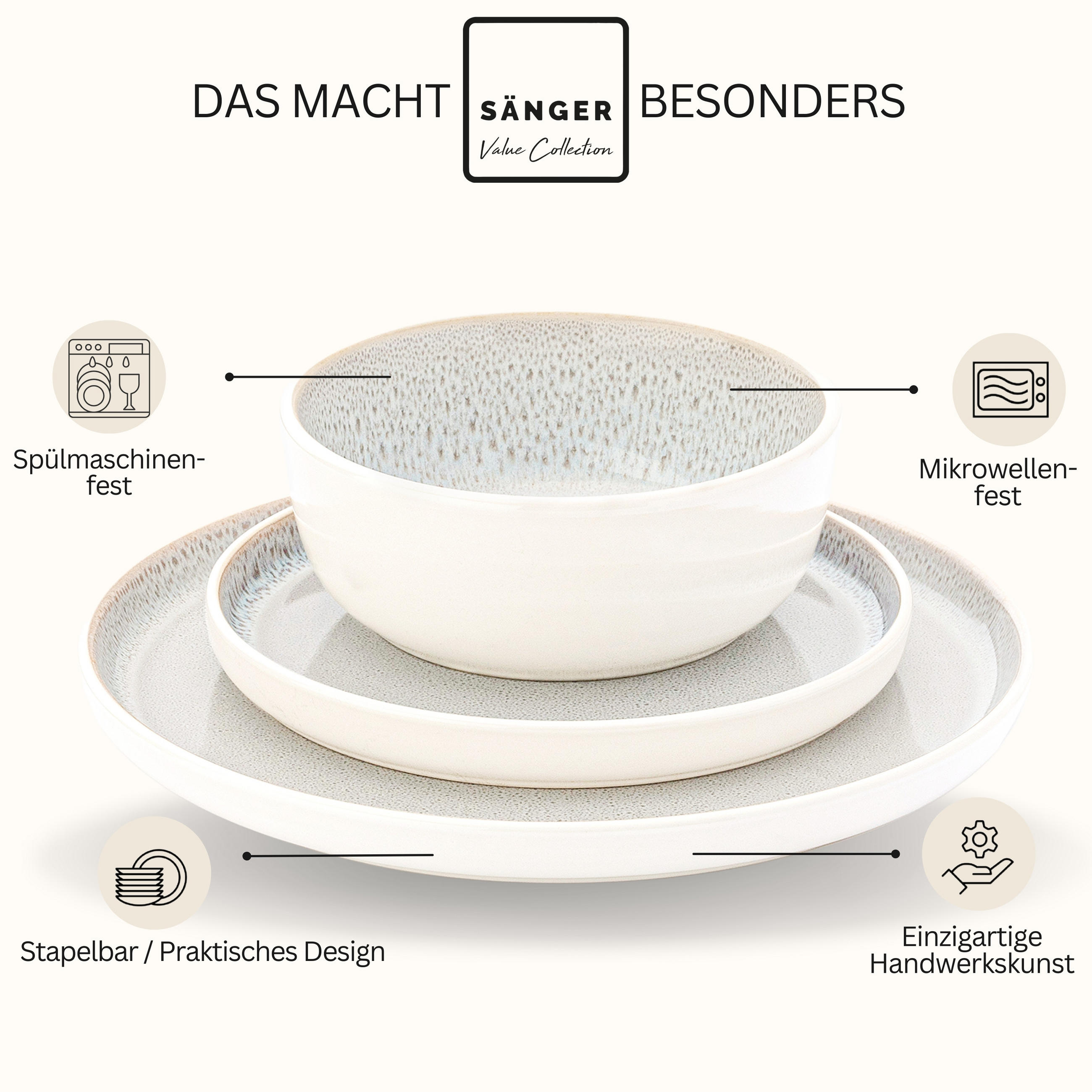 Почувствуйте вневременную красоту Крита с нашим эксклюзивным набором посуды из коллекции Sänger Value. Вдохновленный лучистым солнцем острова, белыми деревнями и лазурным морем, этот высококачественный набор из керамики сочетает в себе естественную элегантность и средиземноморский шарм. Каждое изделие уникально, а его мягкие, светлые оттенки привносят легкость и тепло критского образа жизни прямо на ваш обеденный стол.