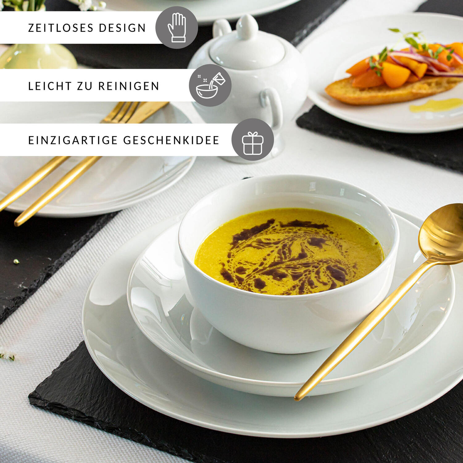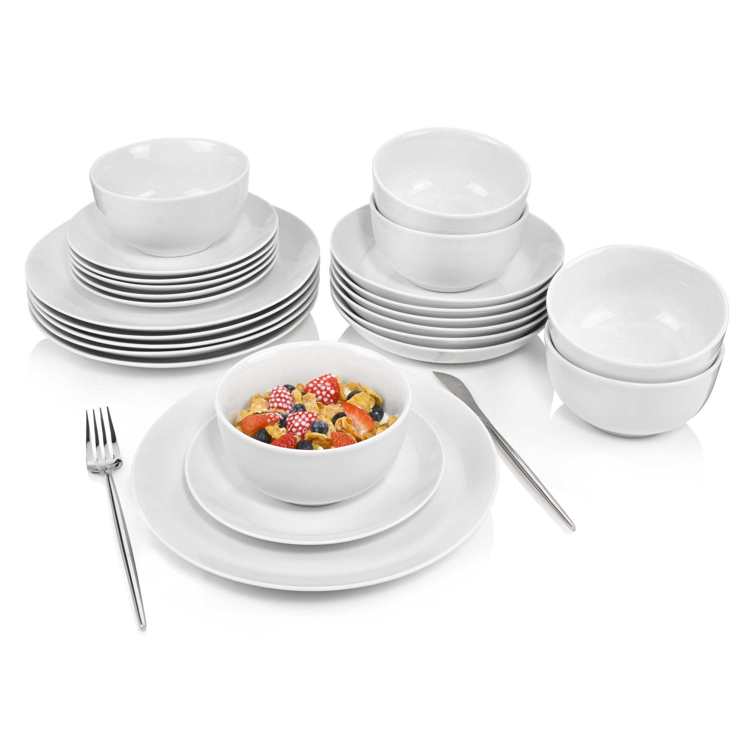 Плавные линии без прерываний Это главная особенность этого набора посуды. Плавные, изогнутые наружу линии не прерываются никакими выемками, углами или краями. Идеальный набор посуды для повседневного использования. ВЫСОКОЕ КАЧЕСТВО Этот набор, состоящий из 6 обеденных тарелок, 6 десертных тарелок, 6 суповых тарелок и 6 мисок для хлопьев, впечатляет не только своим внешним видом, но прежде всего качеством. Тарелки отлично ведут себя как в посудомоечной машине, так и в микроволновой печи.