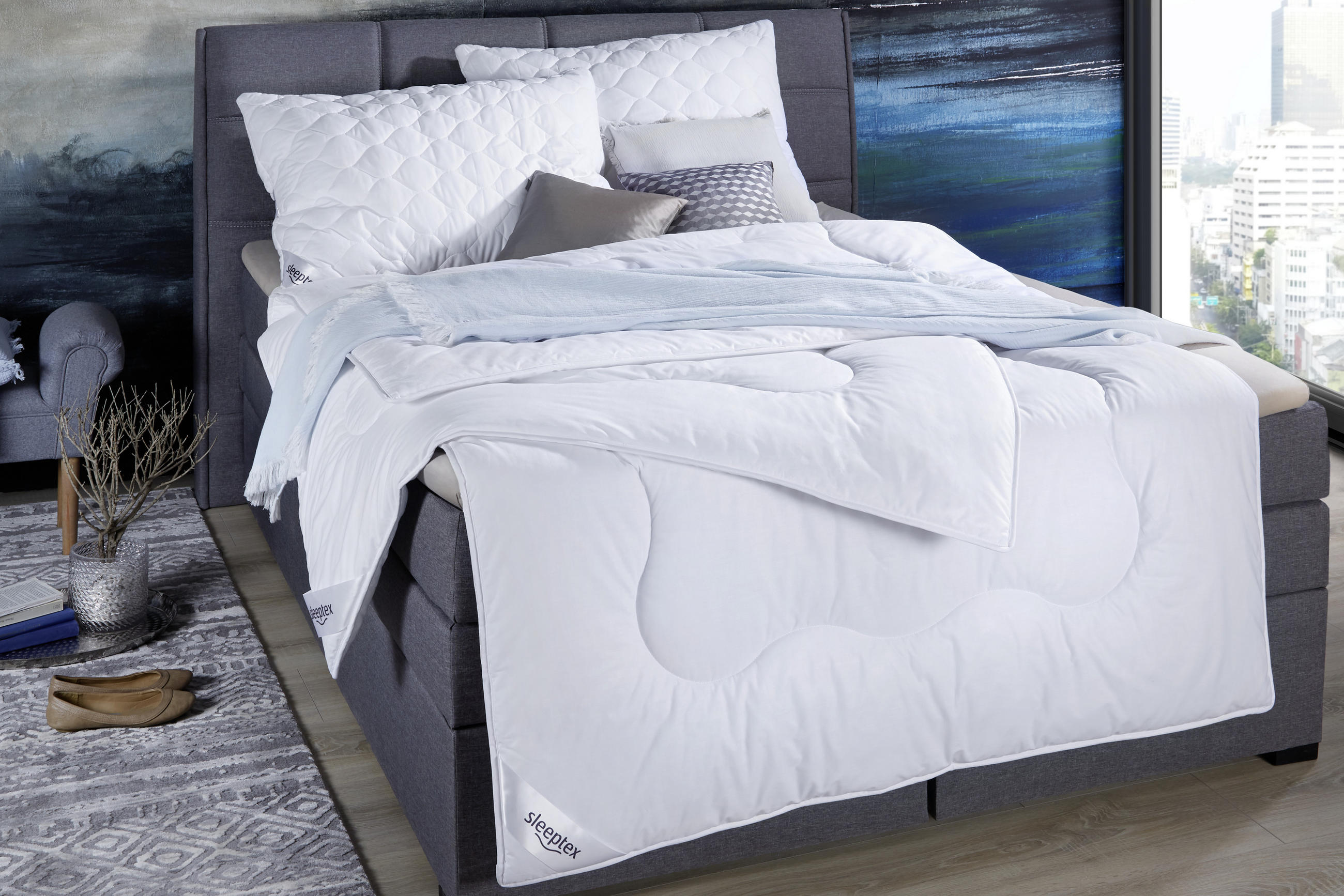 Как можно поднять этот комфорт на еще более высокий уровень? Просто: одеяла и подушки Sleeptex, а также наматрасники, изготовлены из дышащего тенселя, простых в уходе синтетических волокон и натуральных материалов, регулирующих температуру. При выборе следует также учитывать ваш личный тепловой комфорт и время года. В то время как пуховое одеяло с кашемировым чехлом обеспечивает приятное тепло зимой, легкое шелковое одеяло летом дарит приятное ощущение прохлады в жаркие дни. Мы предлагаем лучшее для любых условий сна - таков девиз Sleeptex.