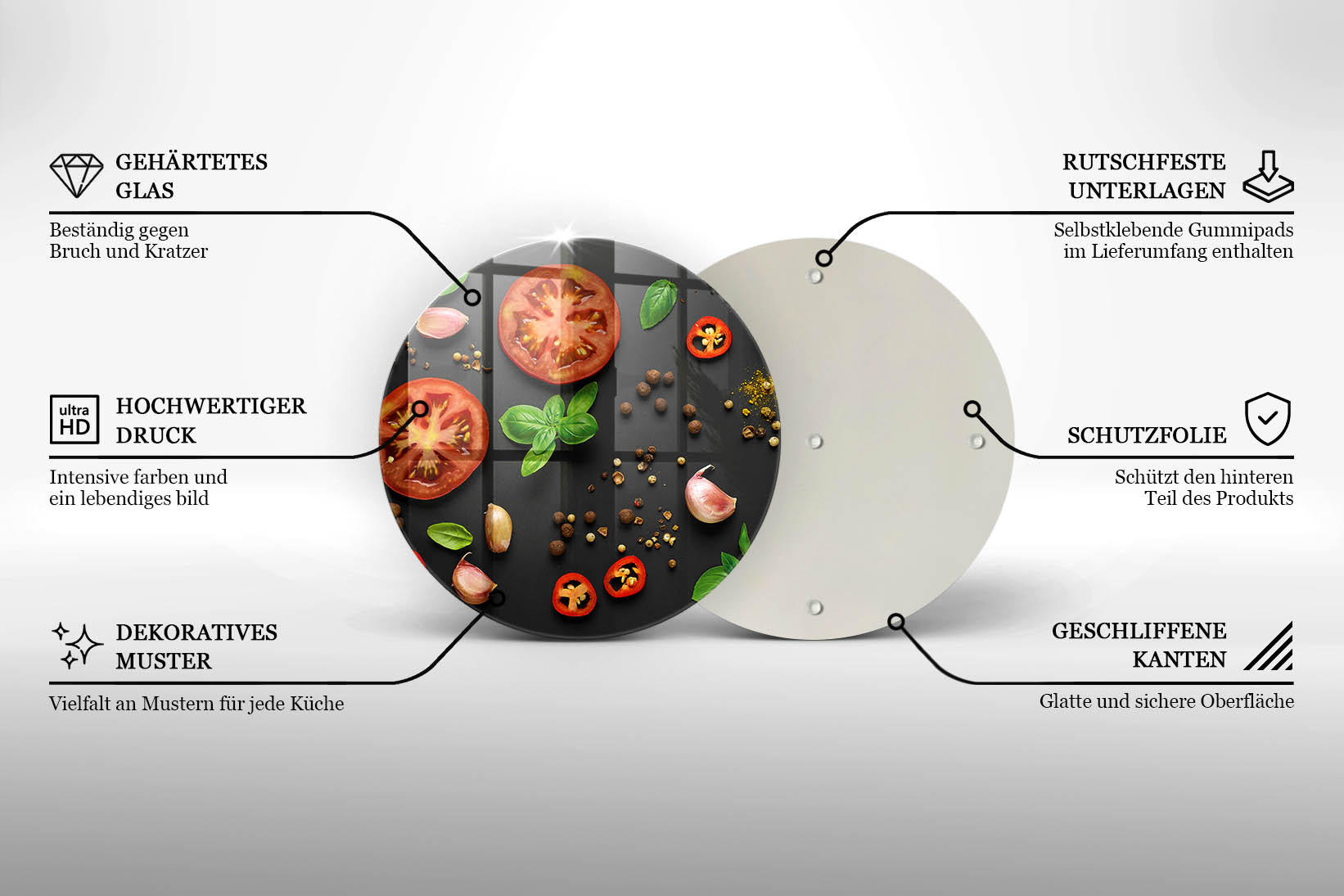 Круглая декоративная стеклянная разделочная доска с современным ярким HD-принтом. Идеально подходит в качестве разделочной доски, сервировочного блюда, подставки под горячее, доски для сыра, доски для завтрака или декоративного кухонного аксессуара. Стильная и функциональная - идеально подходит для любой кухни. Материал и качество изготовления: