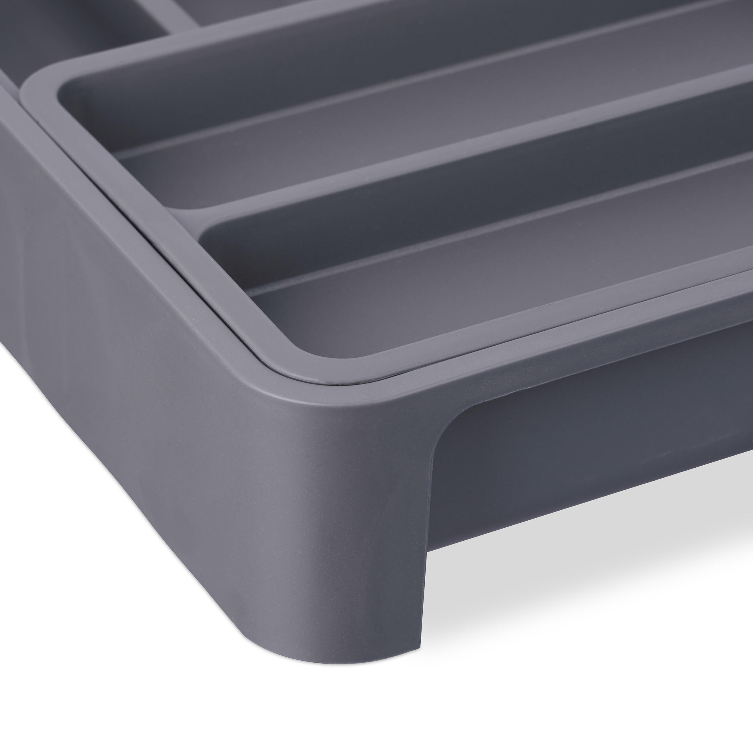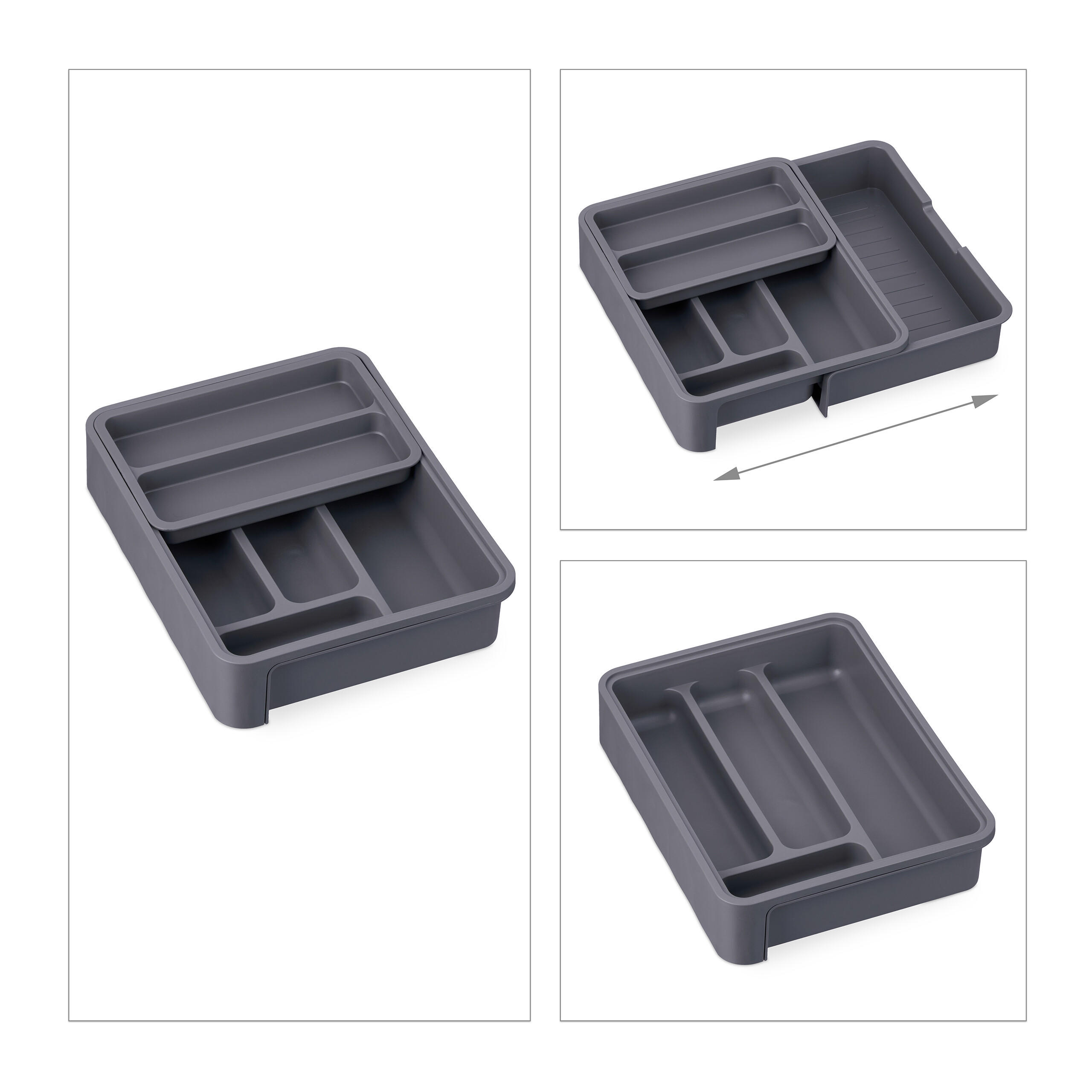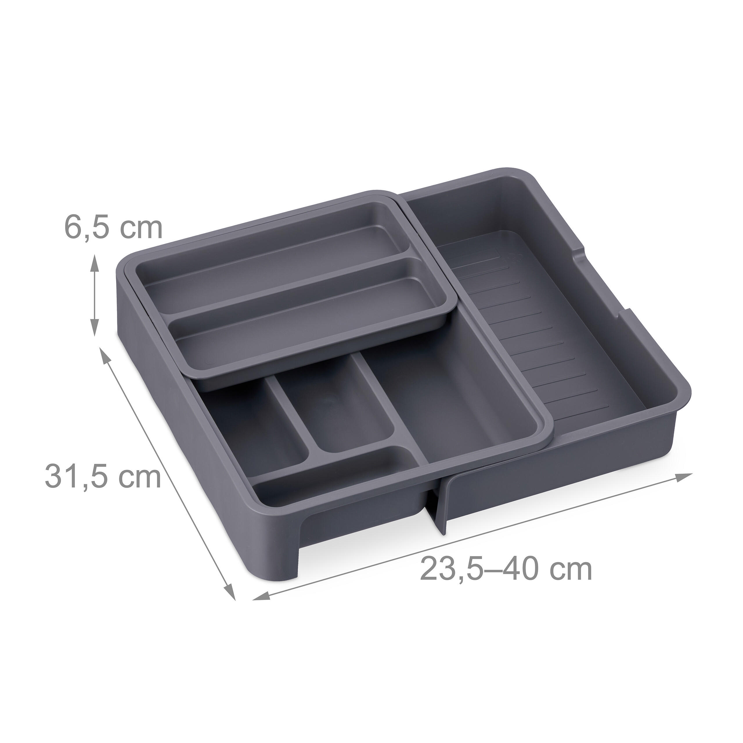 Загроможденные ящики останутся в прошлом благодаря этому лотку для столовых приборов. Вставка для ящика с четырьмя основными отделениями (вставка и выдвижное отделение) предлагает достаточно места для столовых приборов, больших кухонных ножей и различных кухонных принадлежностей. Благодаря регулируемой ширине лоток для столовых приборов адаптируется к различным размерам ящиков. Изготовленная из прочного пластика, вставка легко моется под проточной водой при необходимости. Примечание: Тщательно измерьте свой ящик, чтобы обеспечить идеальную посадку. Подробная информация о лотке для столовых приборов: - Размеры в сложенном виде (В x Ш x Г): ок. 6,5 x 23,5 x 31,5 см - Максимальная общая ширина с выдвинутым отделением: ок. 40 см - Вес: ок. 0,6 кг - Материал: Пластик - Цвет: Темно-серый Система организации пространства в ящике с 7 отделениями - 1 большое продольное отделение (В x Ш x Г): ок. 2 x 7 x 29 см - 2 средних продольных отделения (В x Ш x Г): ок. 2 x 5 x 22 см - 1 небольшое поперечное отделение (В x Ш x Г): приблизительно 2 x 12 x 4 см - Габаритные размеры вставки (В x Ш x Г): приблизительно 2,5 x 22 x 15 см - Внутренние размеры вставных отделений (В x Ш x Г): ок. 2 x 20 x 6 см