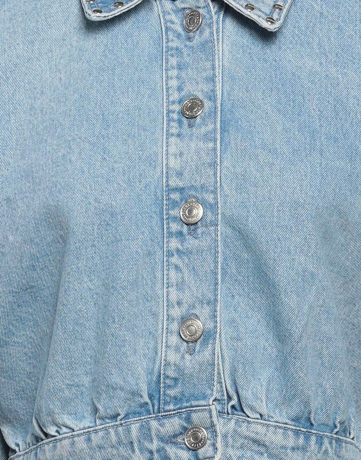 Джинсовая куртка, джинсовая ткань, выцветшая, однотонная с аппликациями, логотип бренда, заклепки, средний оттенок, классический воротник, однобортная, длинные рукава, без подкладки, застежка на пуговицы, без карманов