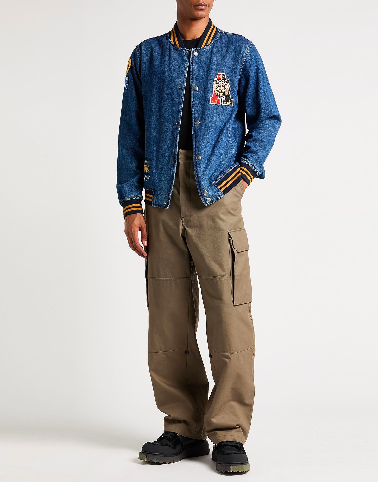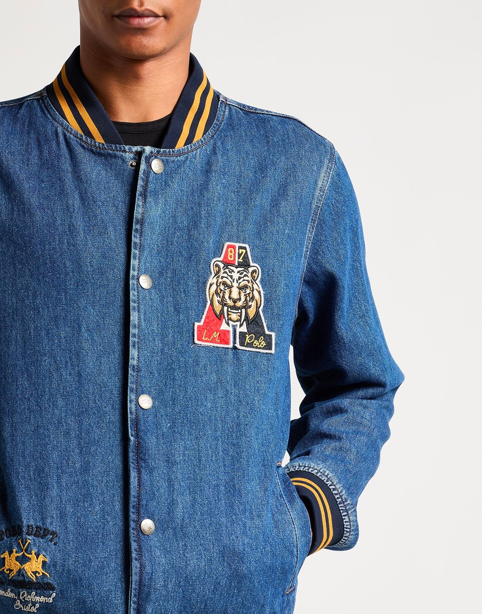 Джинсовая куртка-бомбер, джинсовая ткань, логотип бренда, нашивки, однотонная с аппликациями, средний оттенок, круглый вырез, длинные рукава, без подкладки, застежка на кнопки, прорезные карманы, машинная стирка или химчистка, не отбеливать, сушить в сушилке