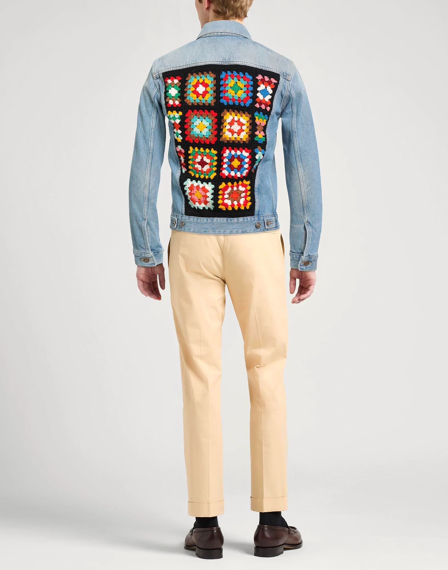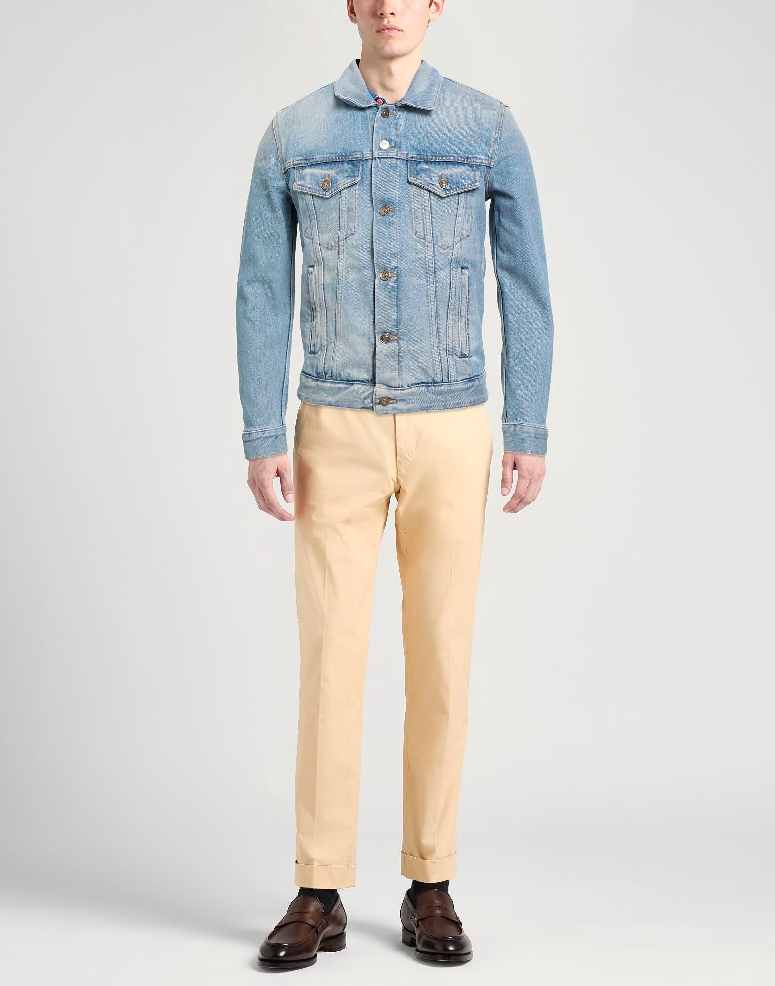 Джинсовая куртка-тракер, джинсовая ткань, выцветшая, трикотажная отделка, однотонная, средняя степень потертости, классический воротник, длинные рукава, манжеты на пуговицах, без подкладки, застежка на пуговицы, два нагрудных кармана, прорезные карманы, химчистка, не отбеливать, не сушить в сушильной машине