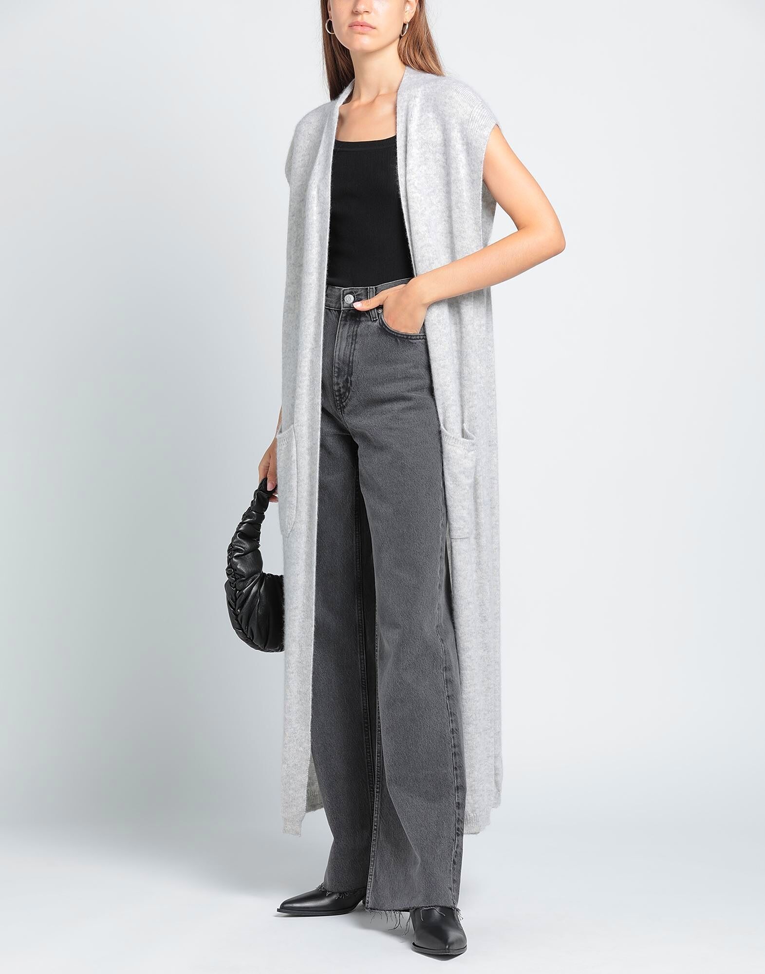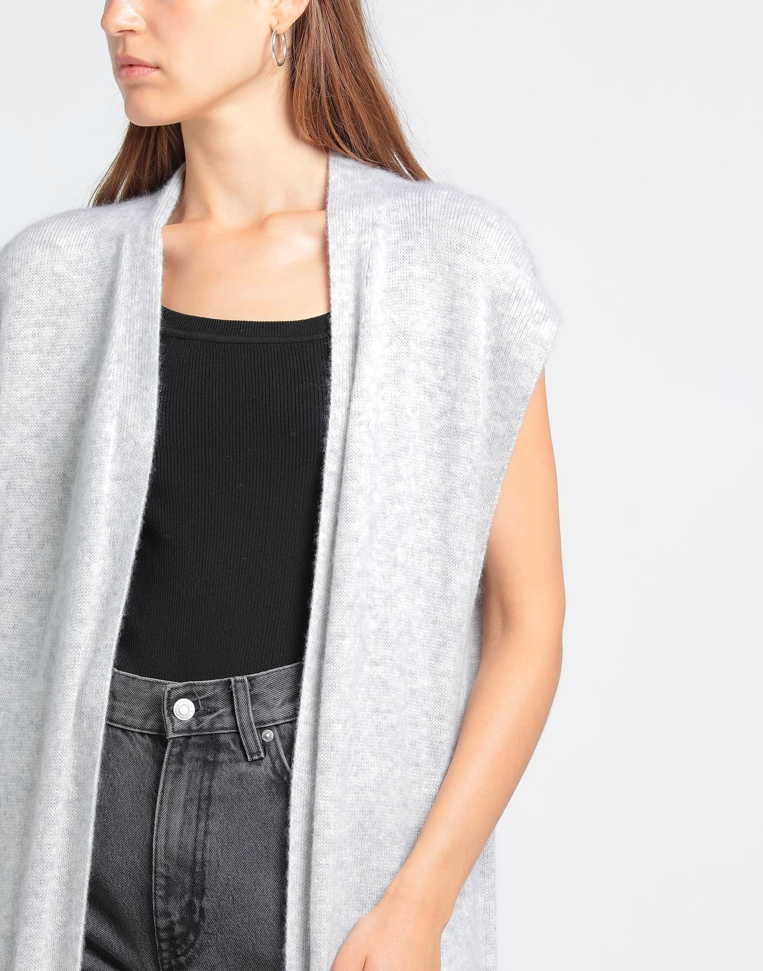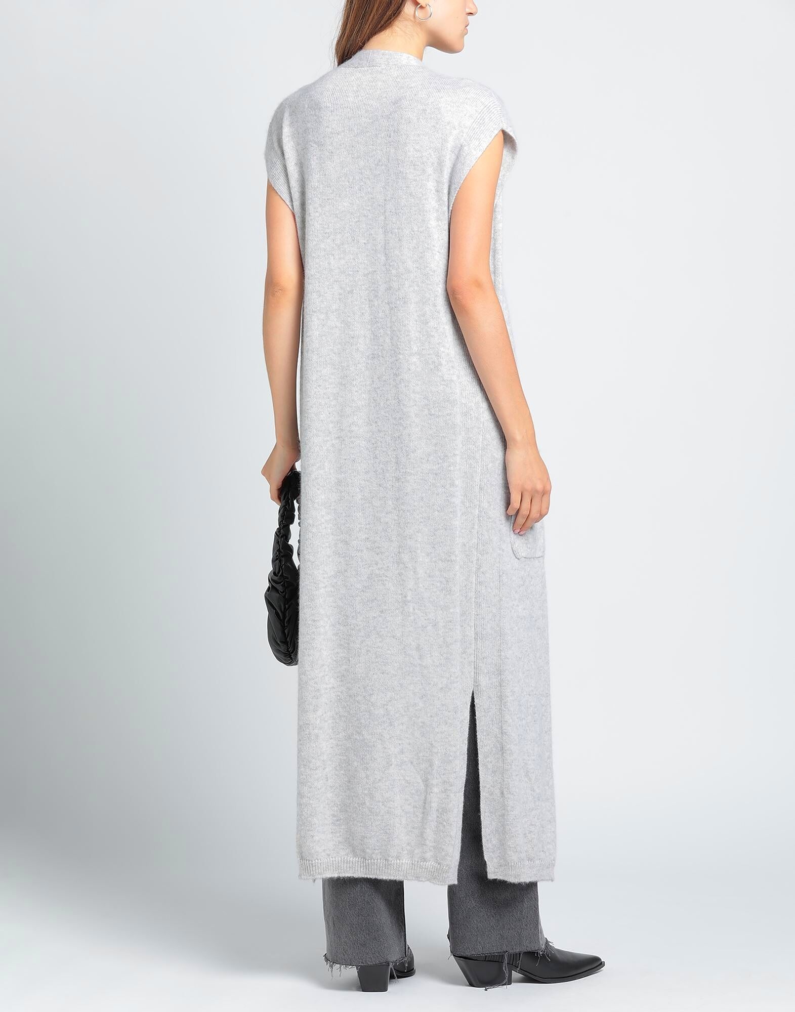 Вязаное, меланжевое, легкое вязаное полотно, без аппликаций, однотонное, глубокий вырез, без рукавов, много карманов
