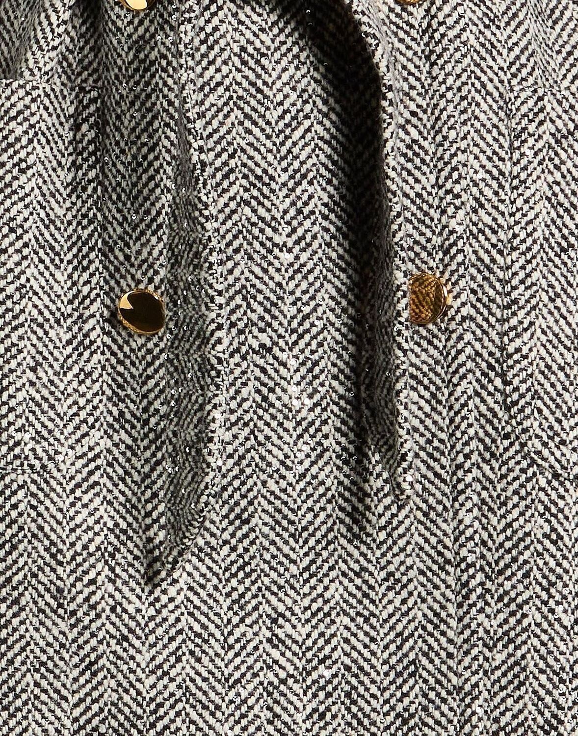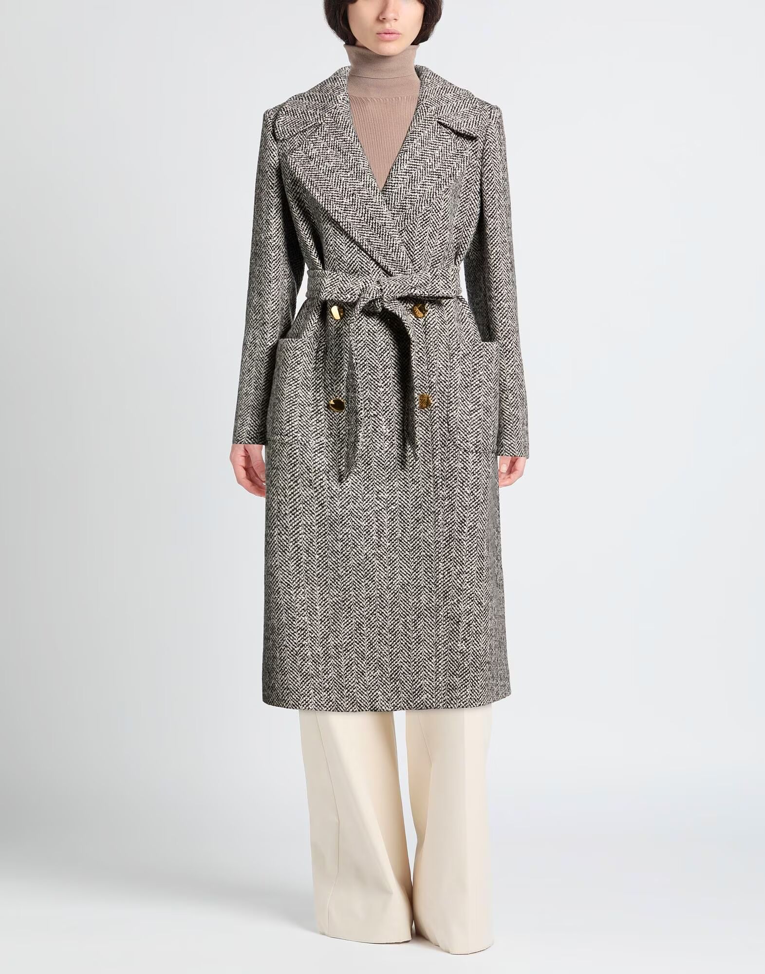 Пальто с поясом, твид, пайетки, елочка, воротник с лацканами, двубортное, длинные рукава, на подкладке, застежка на пуговицы, накладные карманы, химчистка, не отбеливать, не сушить в сушильной машине, этот бренд большемерит