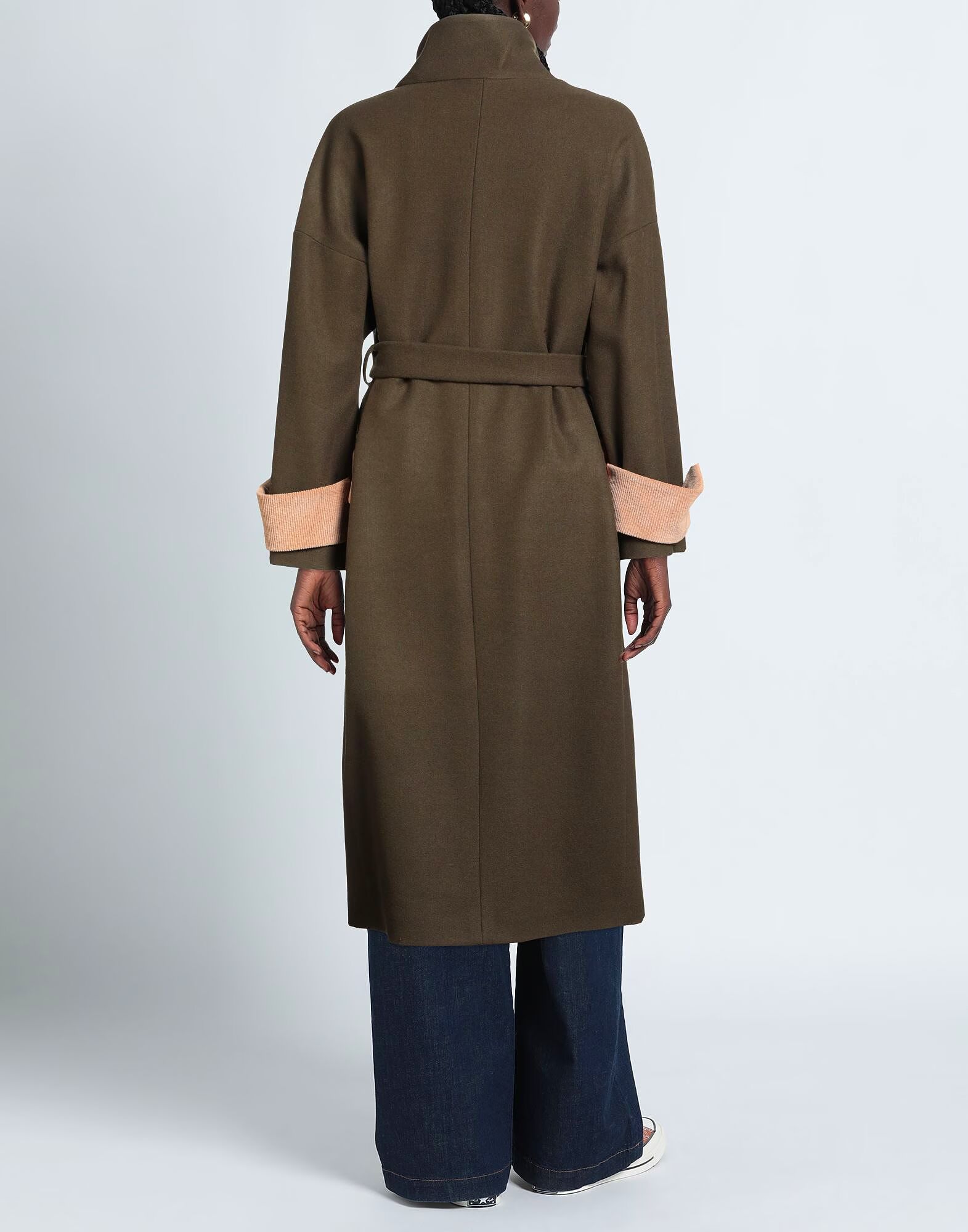 Пальто с поясом, фетр, вельветовая отделка, пояс, однотонное, водолазка, однобортное, длинные рукава, на подкладке, застежка на пуговицы, накладные карманы, химчистка, не отбеливать, не сушить в сушильной машине Деловой стиль сочетается с элегантностью в этом шикарном офисном наряде, который будет вселять уверенность каждый день