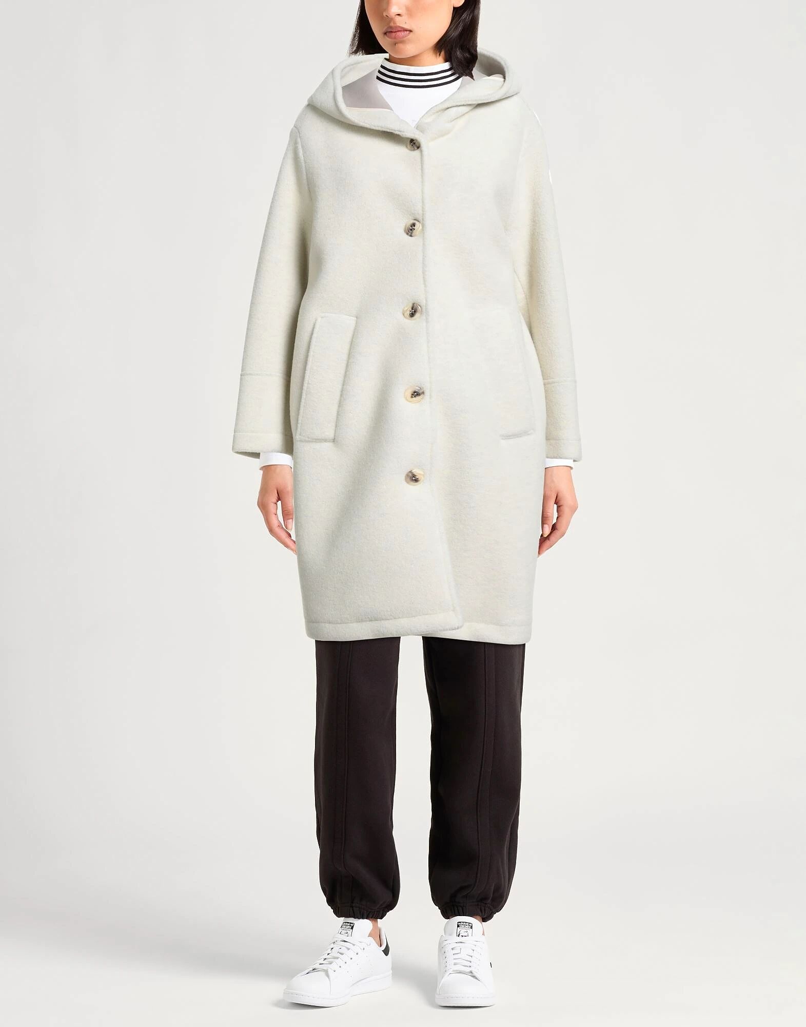 Однобортное пальто, фетр, эластичная ткань, логотип бренда, однотонное, с капюшоном, длинные рукава, без подкладки, застежка на пуговицы, прорезные карманы, машинная стирка или химчистка, не отбеливать, не сушить в сушильной машине