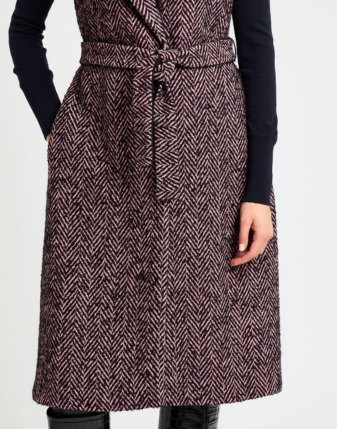 Пальто с поясом, твид, букле, эластичная ткань, пояс, ёлочка, воротник с лацканами, однобортное, без рукавов, полностью на подкладке, завязка, прорезной карман, химчистка, не отбеливать, не сушить в сушильной машине Деловой стиль сочетается с элегантностью в этом шикарном офисном наряде, который будет вселять уверенность каждый день