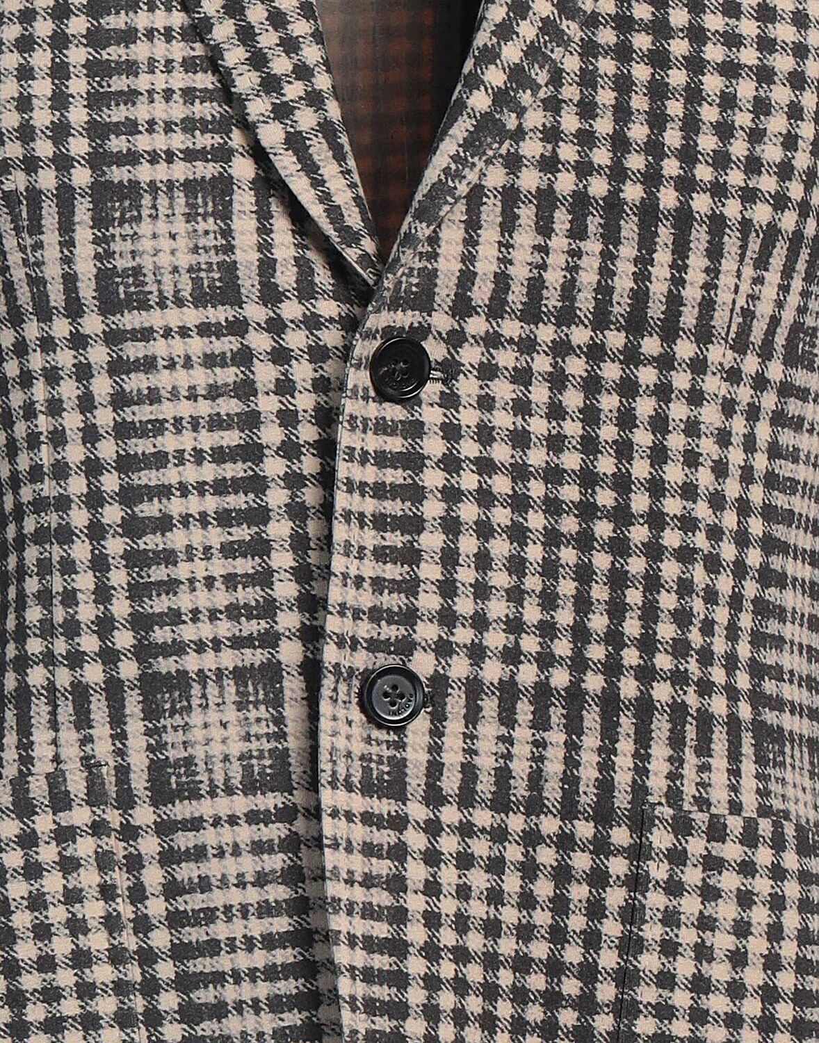 Трикотаж, без аппликаций, клетка «гусиная лапка», воротник с лацканами, однобортный, длинные рукава, застежка на пуговицы, много карманов, эластичный, ручная стирка, не отбеливать, не сушить в сушильной машине, однобортный блейзер